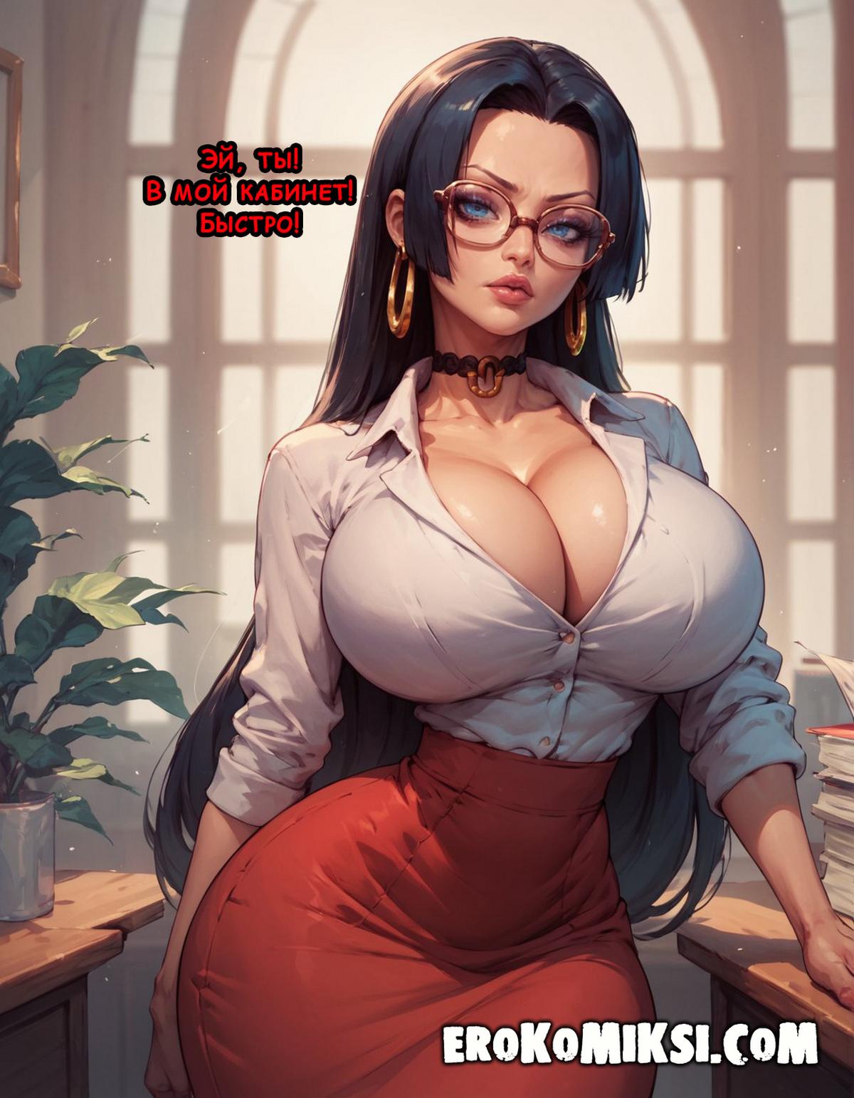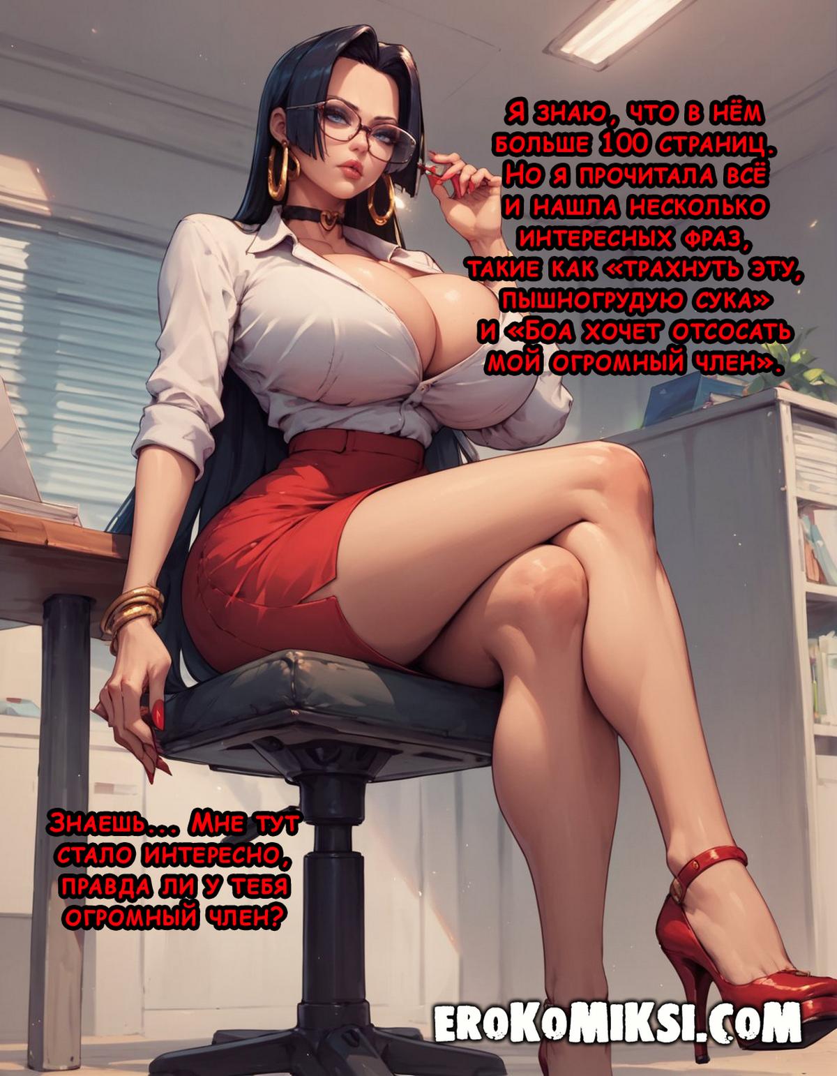 Порно комикс Ван Пис. Боа — Офисная Сучка. Боа Хэнкок вызвала ГГ обсудить его последний отчёт. Там среди 100 страниц его писанины было несколько моментов, которые её заинтересовали — а именно те, где он писал, что трахнул бы Боа и что у него большой член. Она решила проверить это лично.