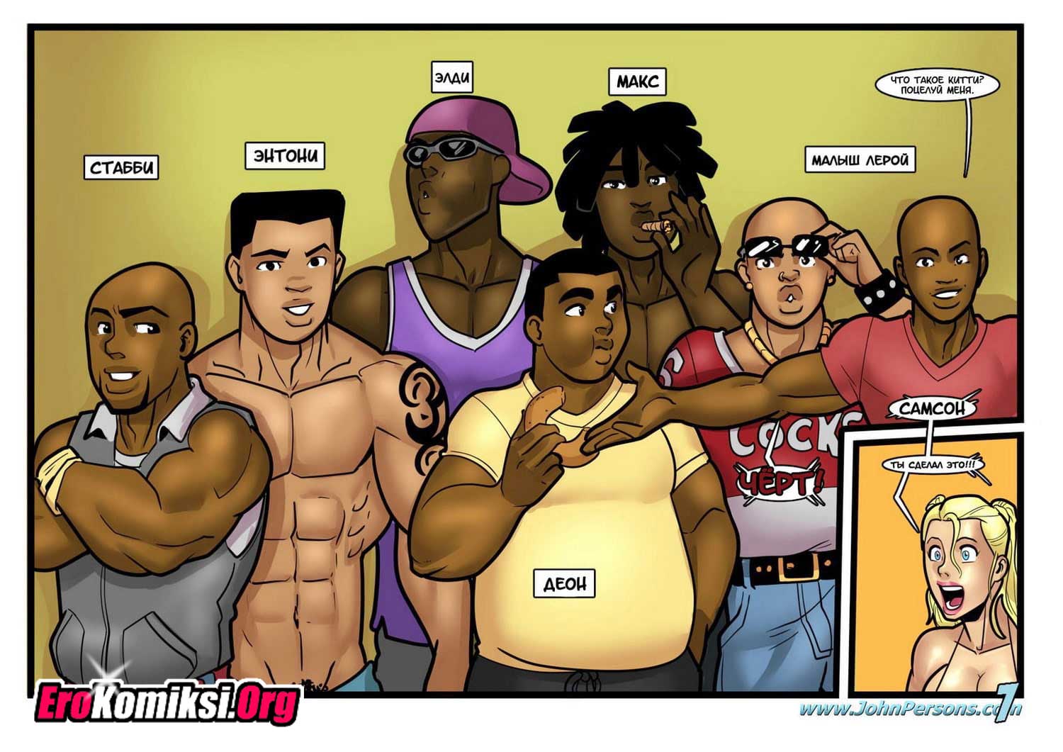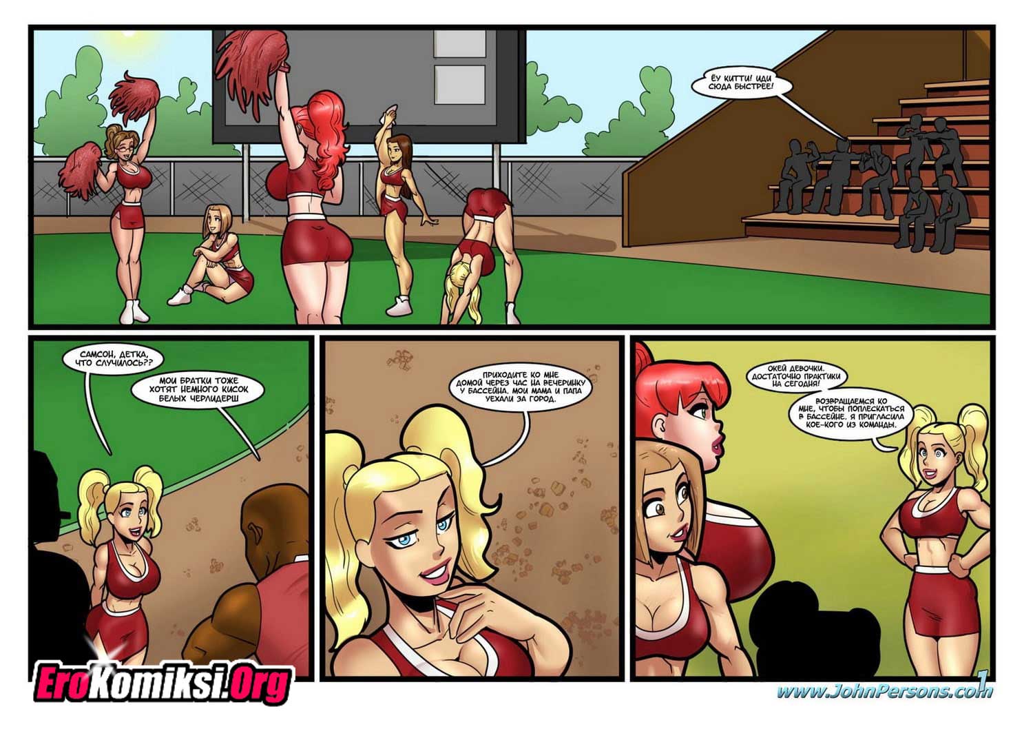 Порно комикс Вечеринка у бассейна. Компания развратных студенток устроили вечеринку у бассейна в доме одной из девушек. Они пригласили на вечеринку парней из футбольной команды. Почти все парни чернокожие и славятся в университете своими огромными членами. Девчонки подобрали для себя пару и все вместе они пошли купать в бассейне. Подростки брызгались и весело проводили время в воде, но основная цель этой вечеринки это опробовать на своих сочных пизденках, огромные члены спортсменов. Каждая красотка отвела своего избранника в отдельную комнаты и предложили секс, парни не из тех отказывает девушкам. Они устроили красоткам отличную порку.