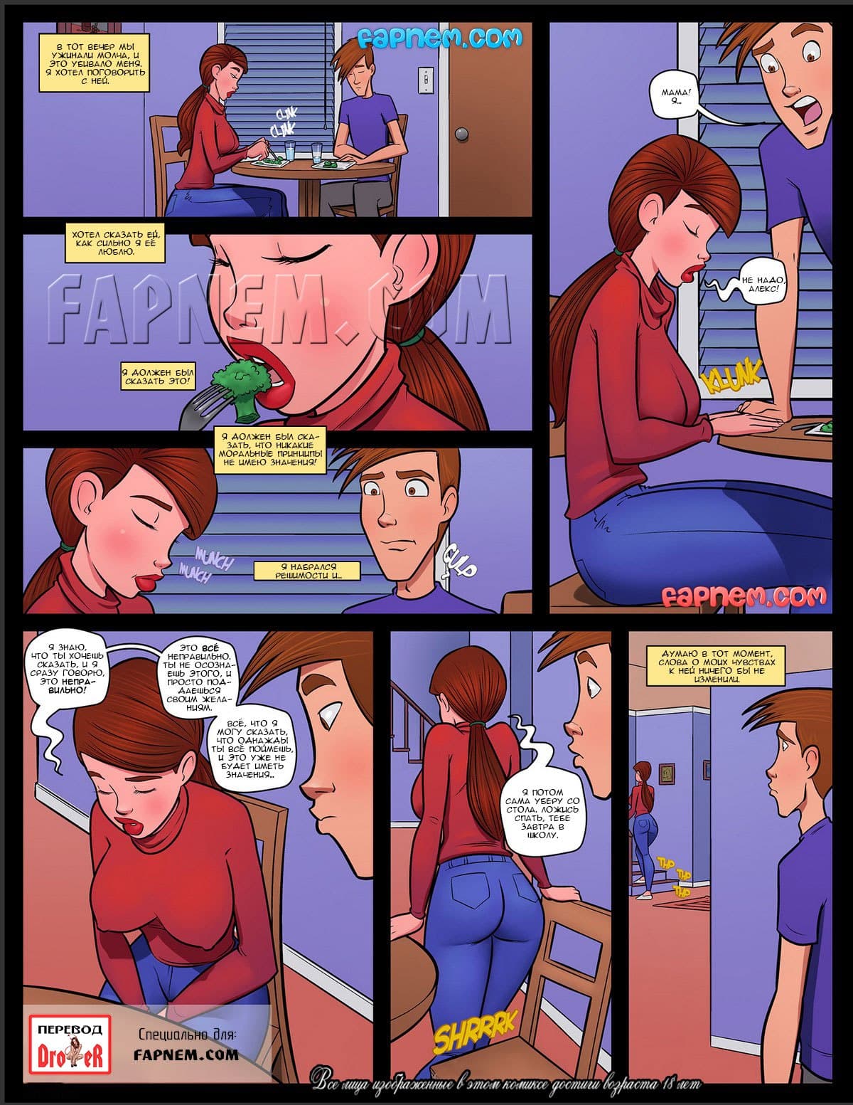 И так долгожданный порно комикс вот это попка продолжается! Сексуальная драма о похотливом парне по имени Алекс и его знойной матушке берет новый старт. Озабоченный юноша вновь находится в похожей ситуации, как и прошлый раз, когда он начал рассказывать о его влечении к аппетитной заднице его зрелой мамаши. Но сейчас Алекс замечает, что его притягивают все женские попы вообще! В то же время мамка наказывает Алекса за его наглость по отношению к ней, и запрещает даже думать об ее заде, хотя сама еле сдерживает свою зудящую похоть…
