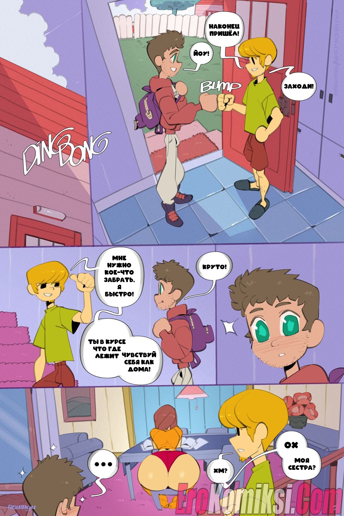Порно комикс Возбужденная порка. Горячая Крашиха. Horny Crush. Roumgu Один юноша пришел в гости с ночевкой к своему другу и с ним решила сексуально повеселиться сочная сестра друга. Развратница стала дрочить член парня, после чего увлекла его к себе в комнату трахаться.