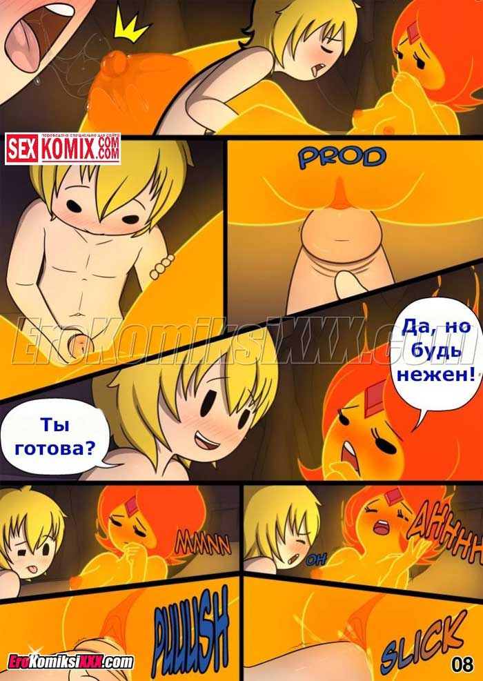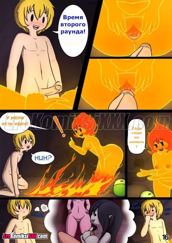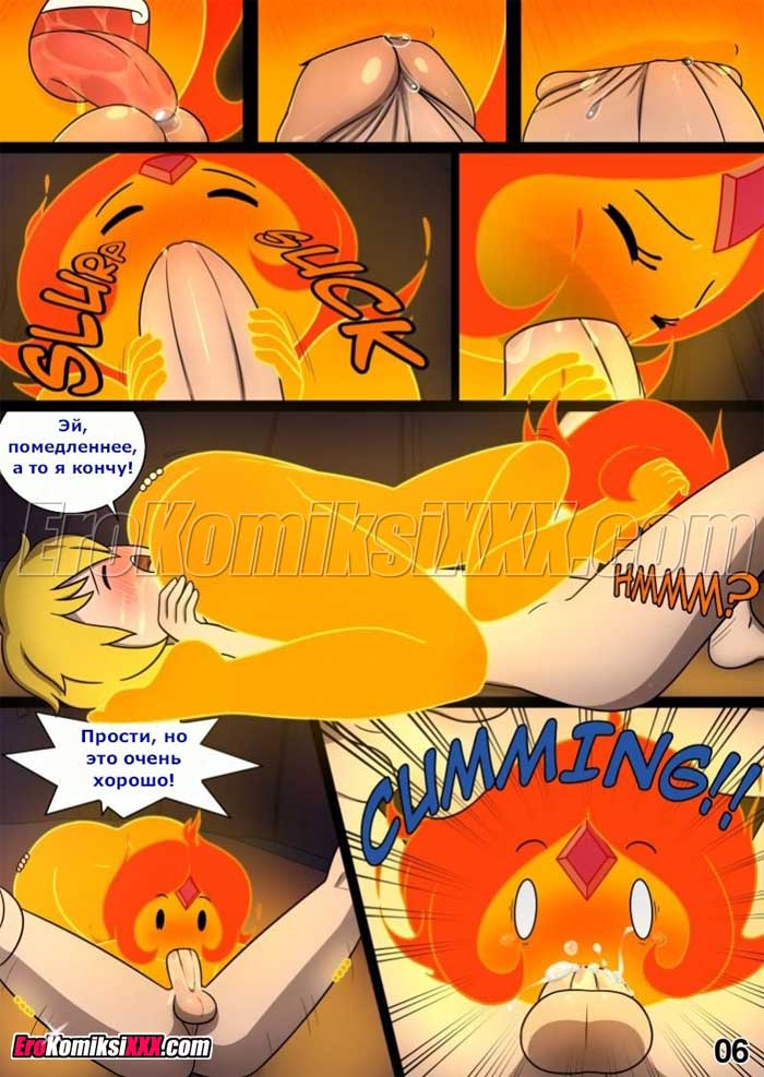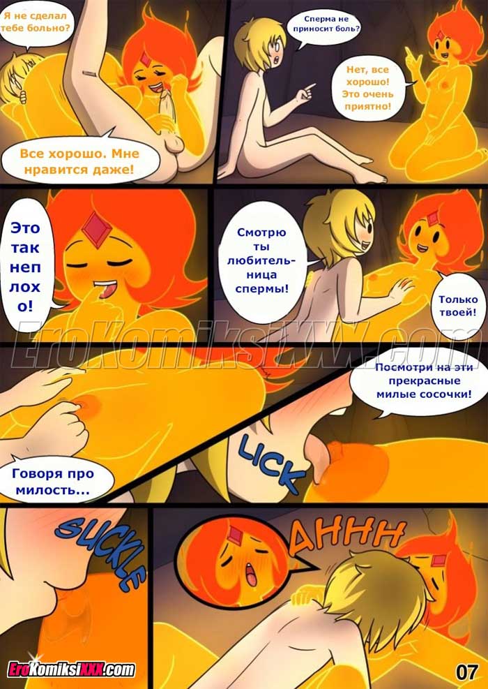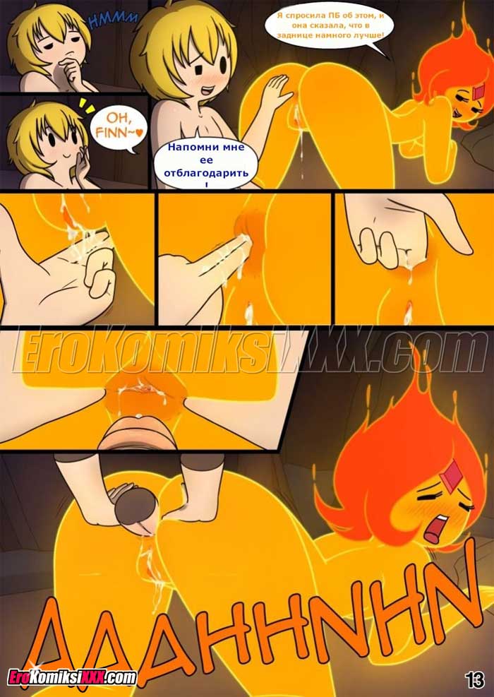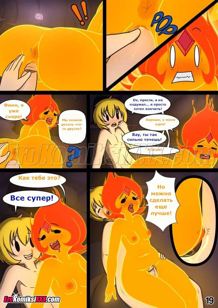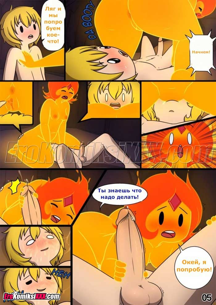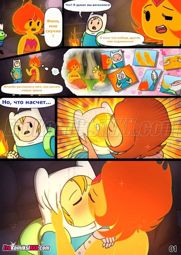 Порно комикс «Время приключений» расскажет о том, как Финн пришёл в гости своей старой знакомой огненный принцессе. Она сидела в пещере и грустила, девушке было очень скучно, и она не знала чем занять себя. Тогда парень предложил ей поразвлечься и заняться сексом. Но когда он прикоснулся к её воспламененному телу, то понял, что этого не получится. На девушка хотела трахаться с Финном и поэтому применила заклинание, после которого стала не такой горячей, и они занялись сексом.