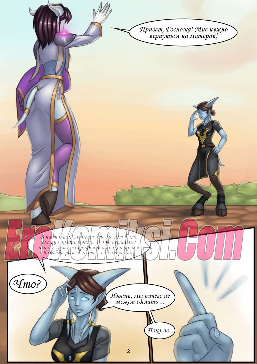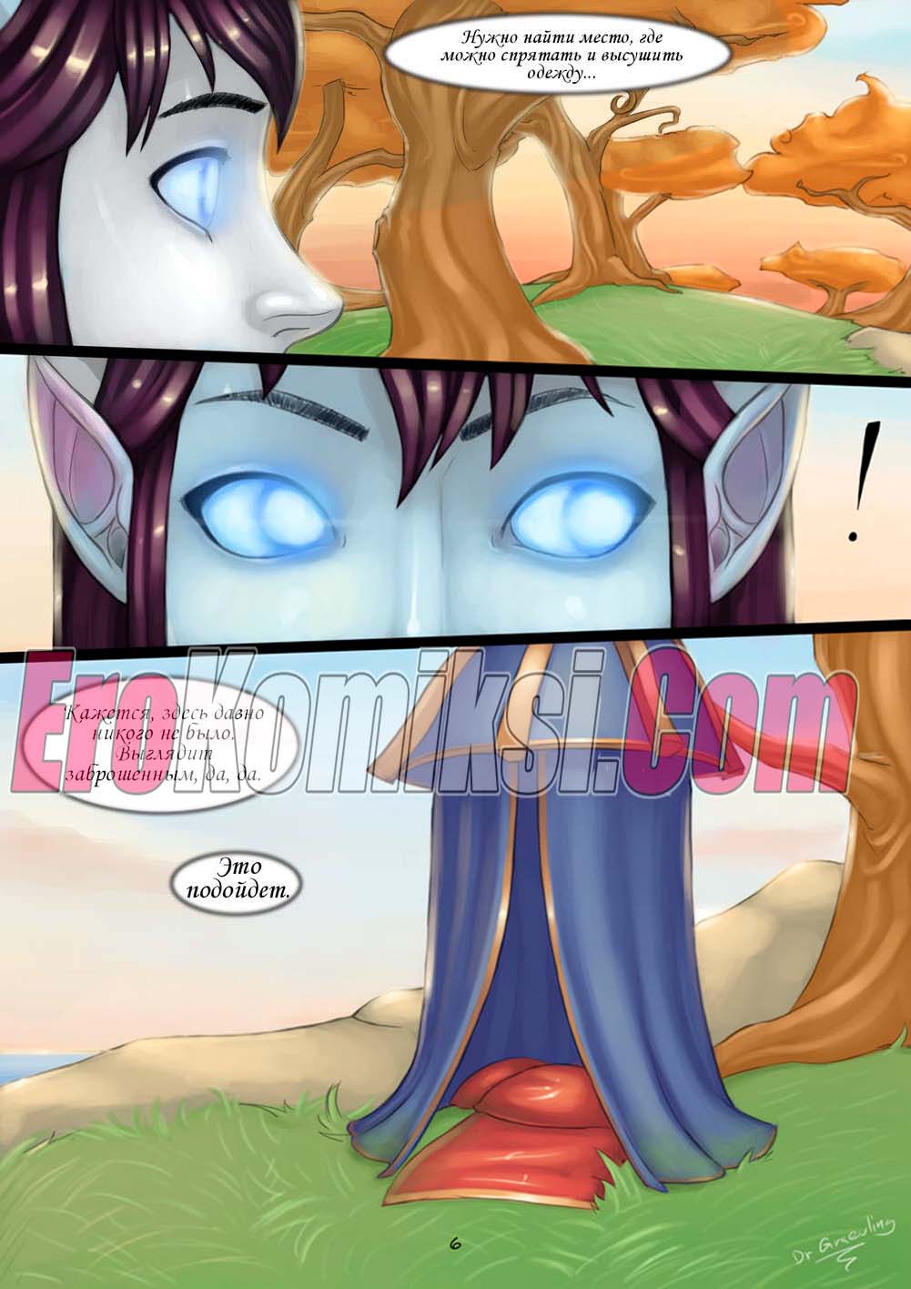 Порно комикс World of Warcraft. Эпические Путешествия и Случайные Встречи. Часть 1. Двое парней застали горячую голую красотку и решили с ней повеселиться. Они стали ласкать ее пизденку, а она у них хорошенько отсосала, после чего парни ее классно выебали.