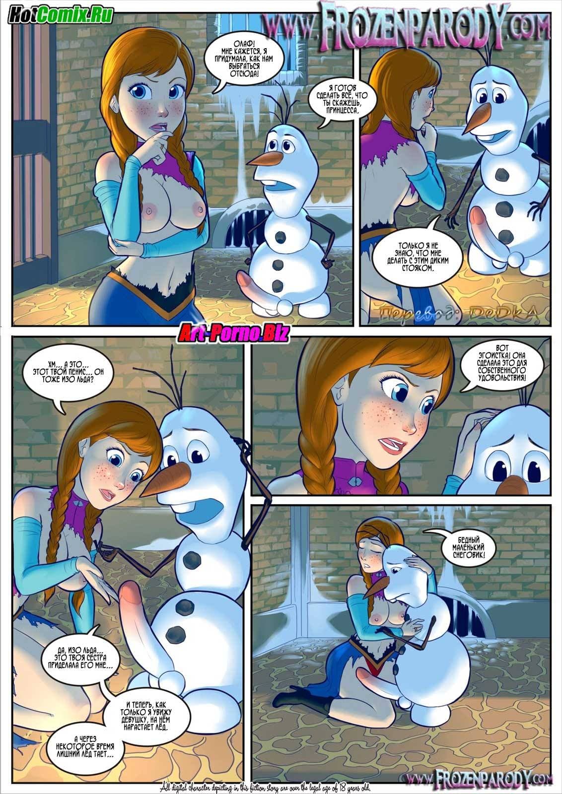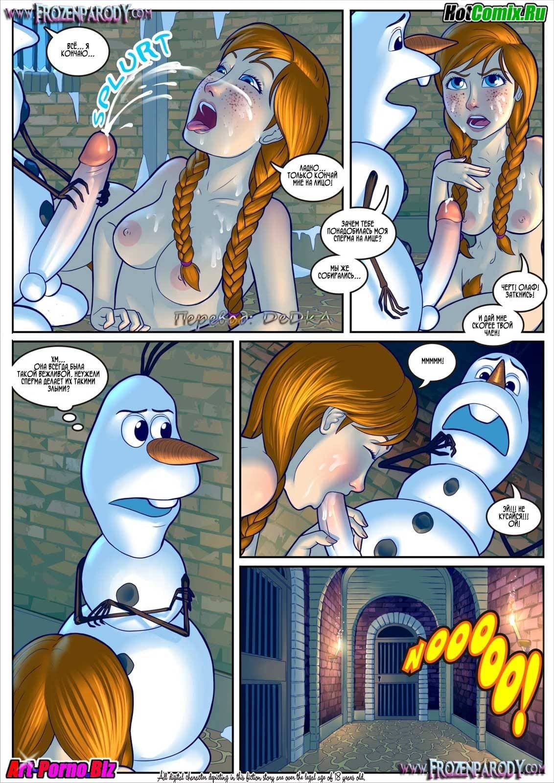 Очередная часть порно комикса холодное сердце покажет Анну, запертую в камеру со снеговиком Олафом. Девушка продумывает план побега и ей, как совсем не глупой особе приходит в голову очень даже интересная идея. Она решает открыть решетку темницы в тот момент, когда охранники пойдут чего-нибудь съесть. А то, что у нее и Олафа нет ключа, Анну особо не тревожит. Ведь она уже придумала, из чьего достоинства можно сделать ключ, который даст ей свободу.
