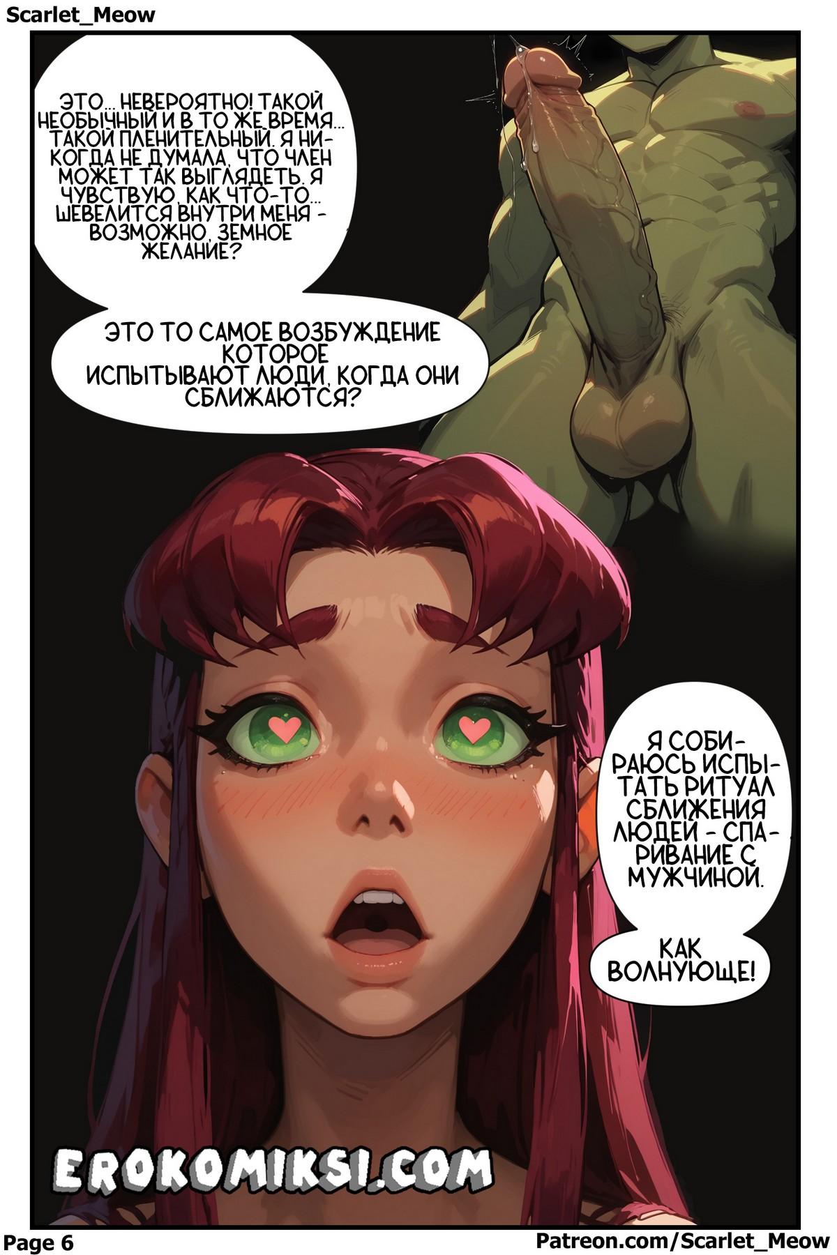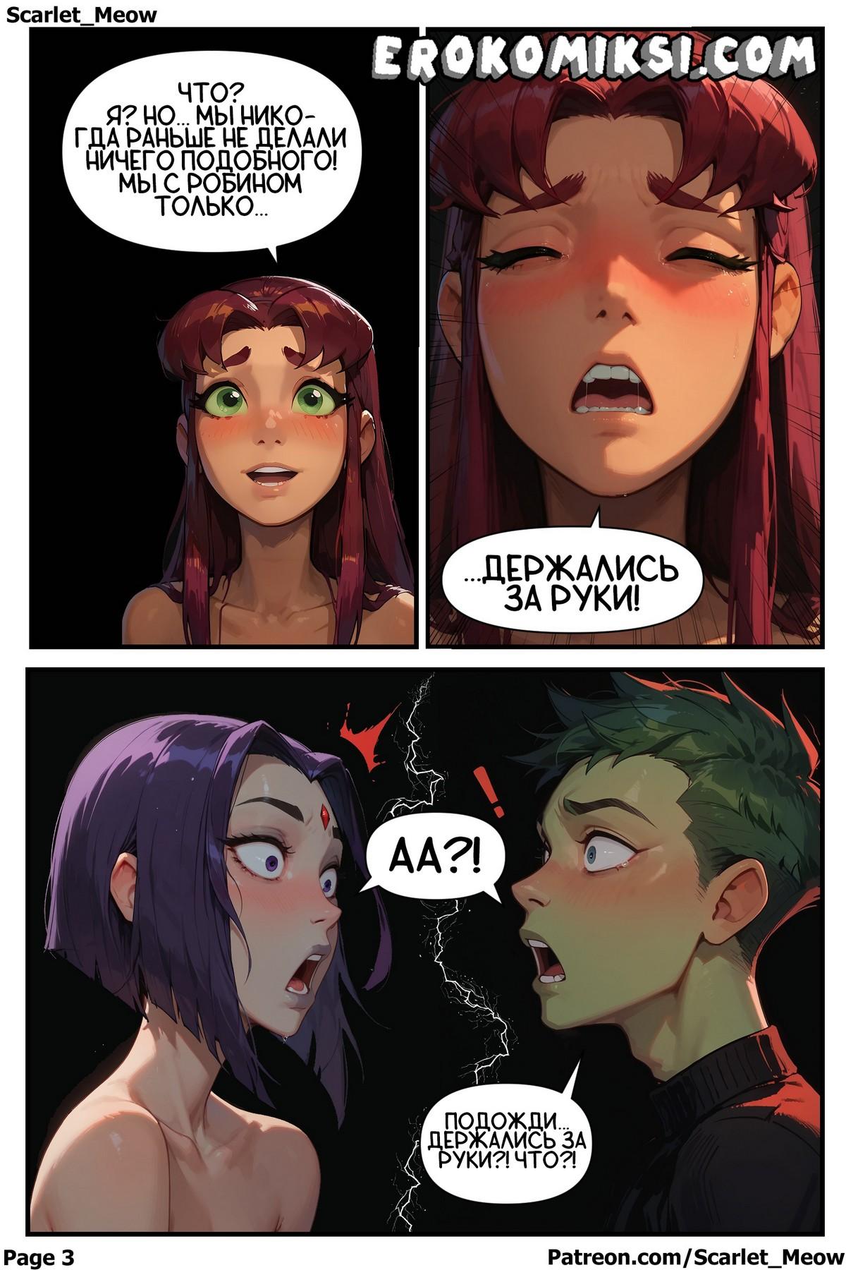 Порно комикс Юные Титаны. Рука Помощи. Часть 4: Титаны объединились. Старфайр сомневалась в правильности своего поступка по отношению к Робину, но Рейвен быстро убедила молодую сучку, что в тройничке с ней и Бистбоем нет нечего такого, если она сама жаждет этого…