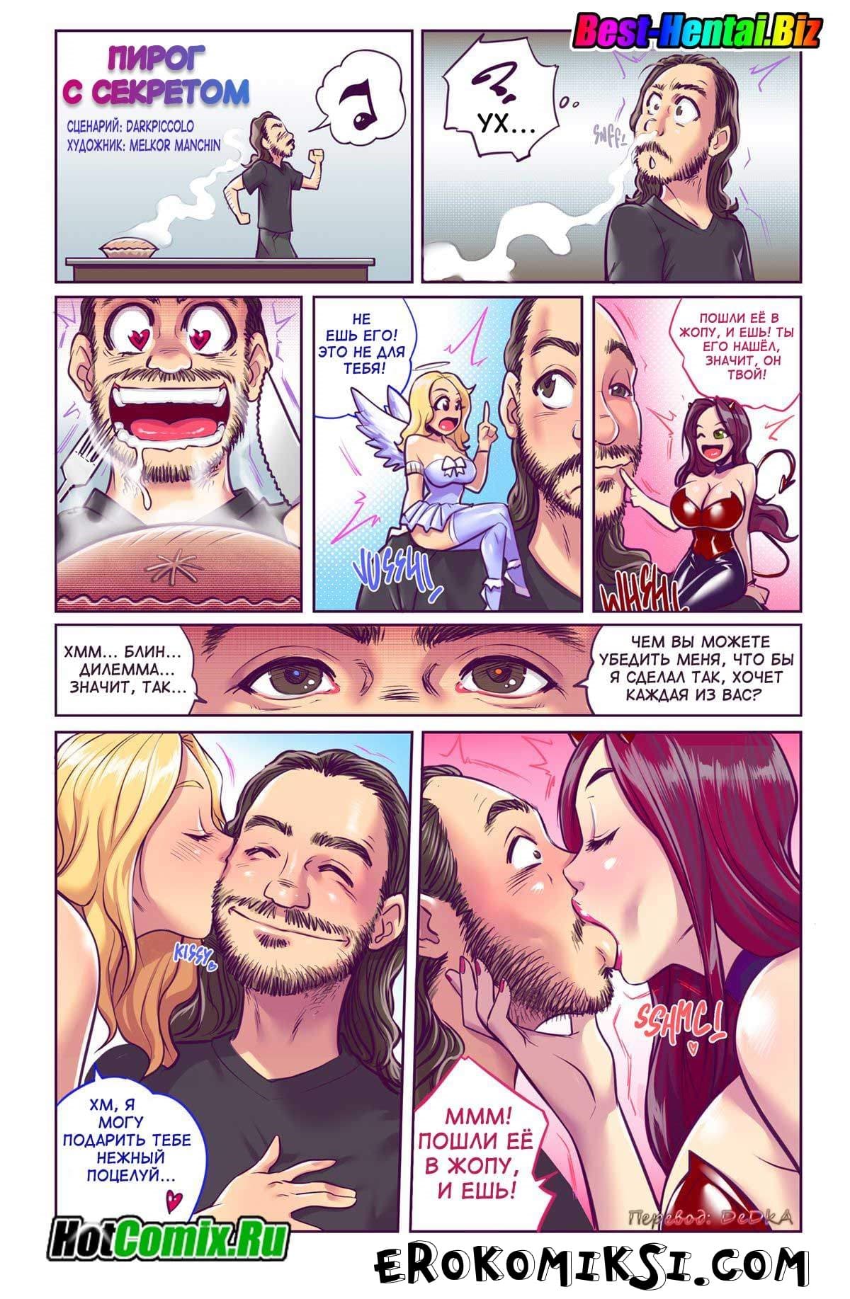 Порно комикс Загадочный пирог начинает свою сексуальную историю с того, что, проходя мимо пирога, парень, учуяв его аппетитный запах, и уже готов был съесть этот подарок судьбы, но вдруг у него на одном плече появился милый ангелочек, а на другом, дерзкая дьяволица. Красотки были абсолютно разные и каждая со своей позицией, но кое-что их все-таки объединяло, они обе были невероятно сексуальны.