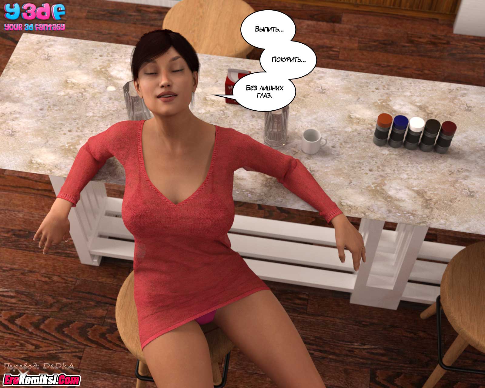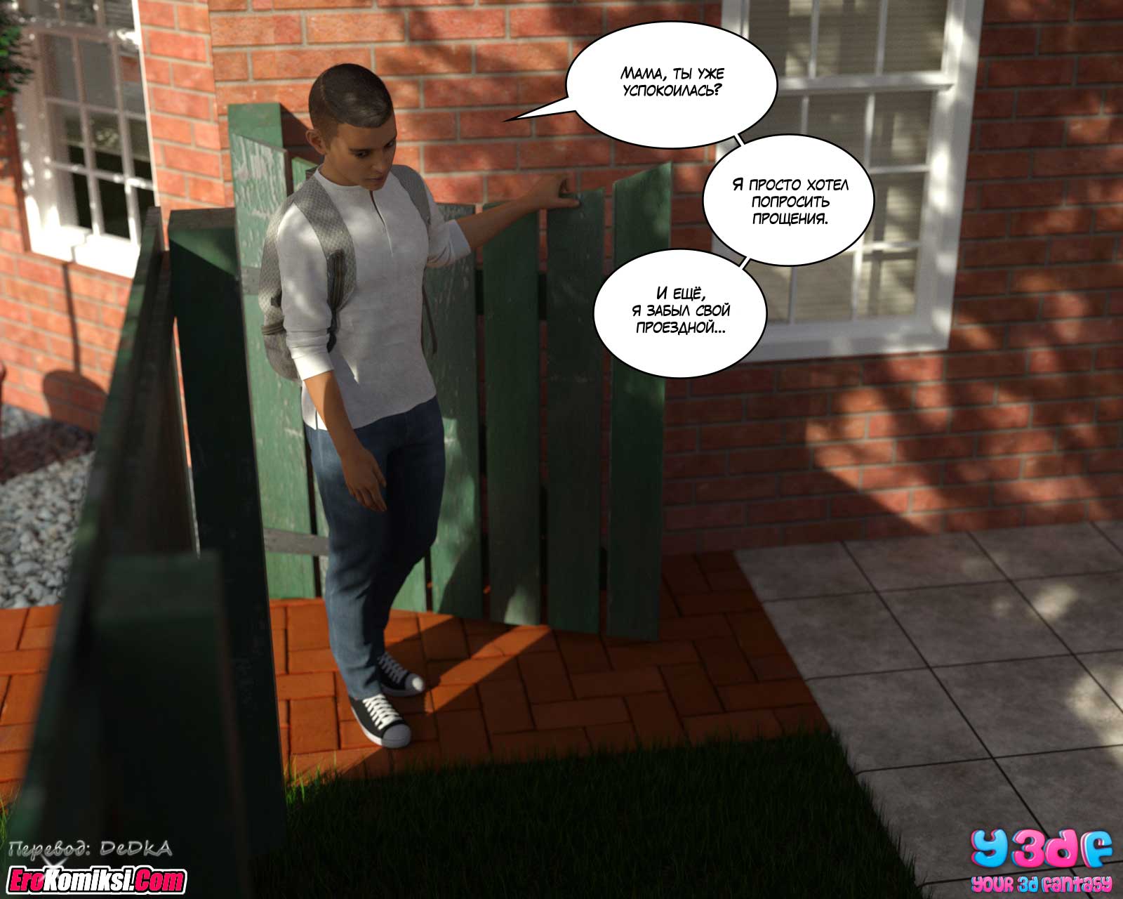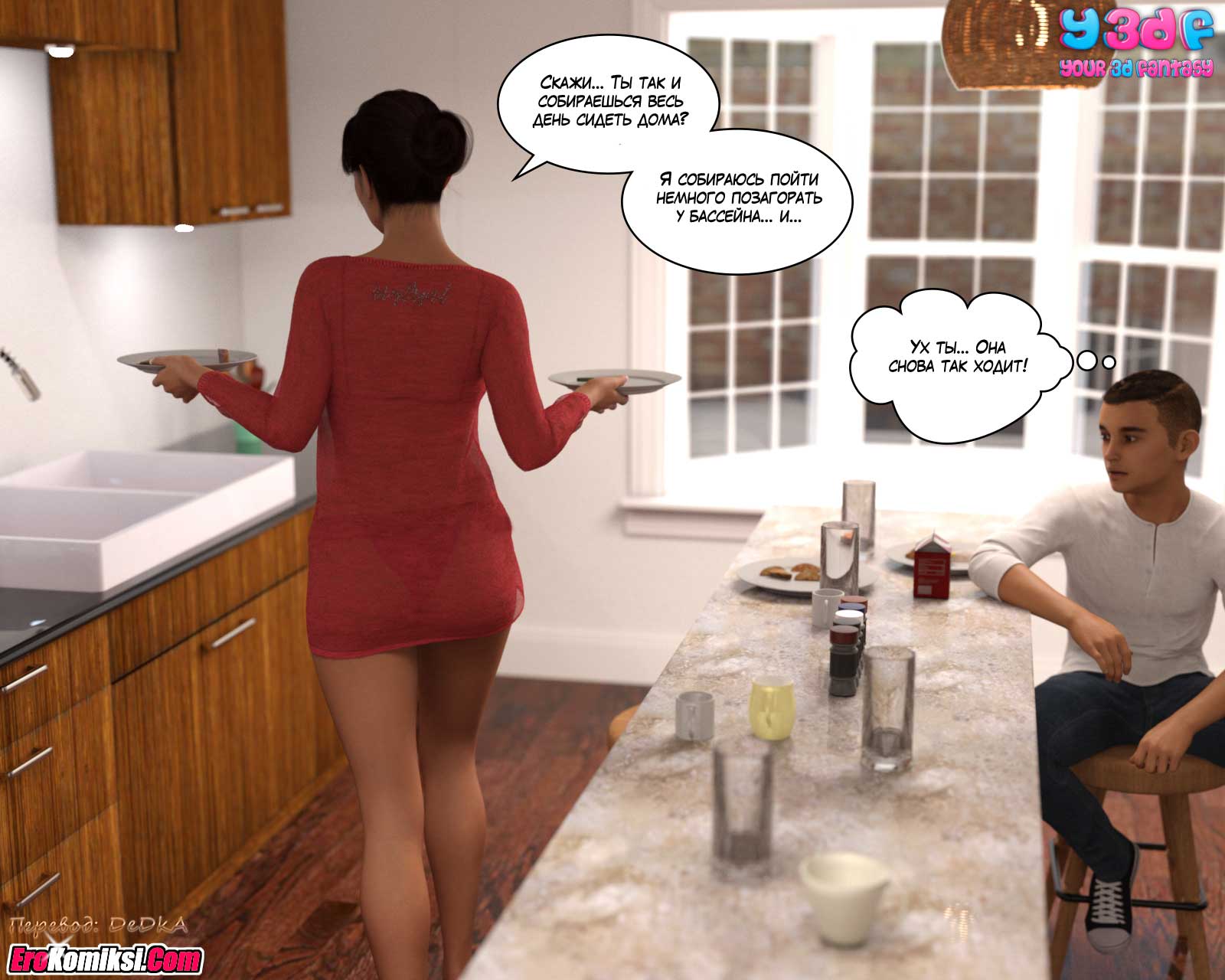Муж с дочерью уехали на выходные, чтобы посмотреть колледж, в который дочь, возможно, будет поступать. Правда, скорее всего, они уехали трахаться. Но об этом мы узнаем из следующих частей комикса. А из этой части вы узнаете, чем будут заниматься, оставшиеся дома, мать и сын.