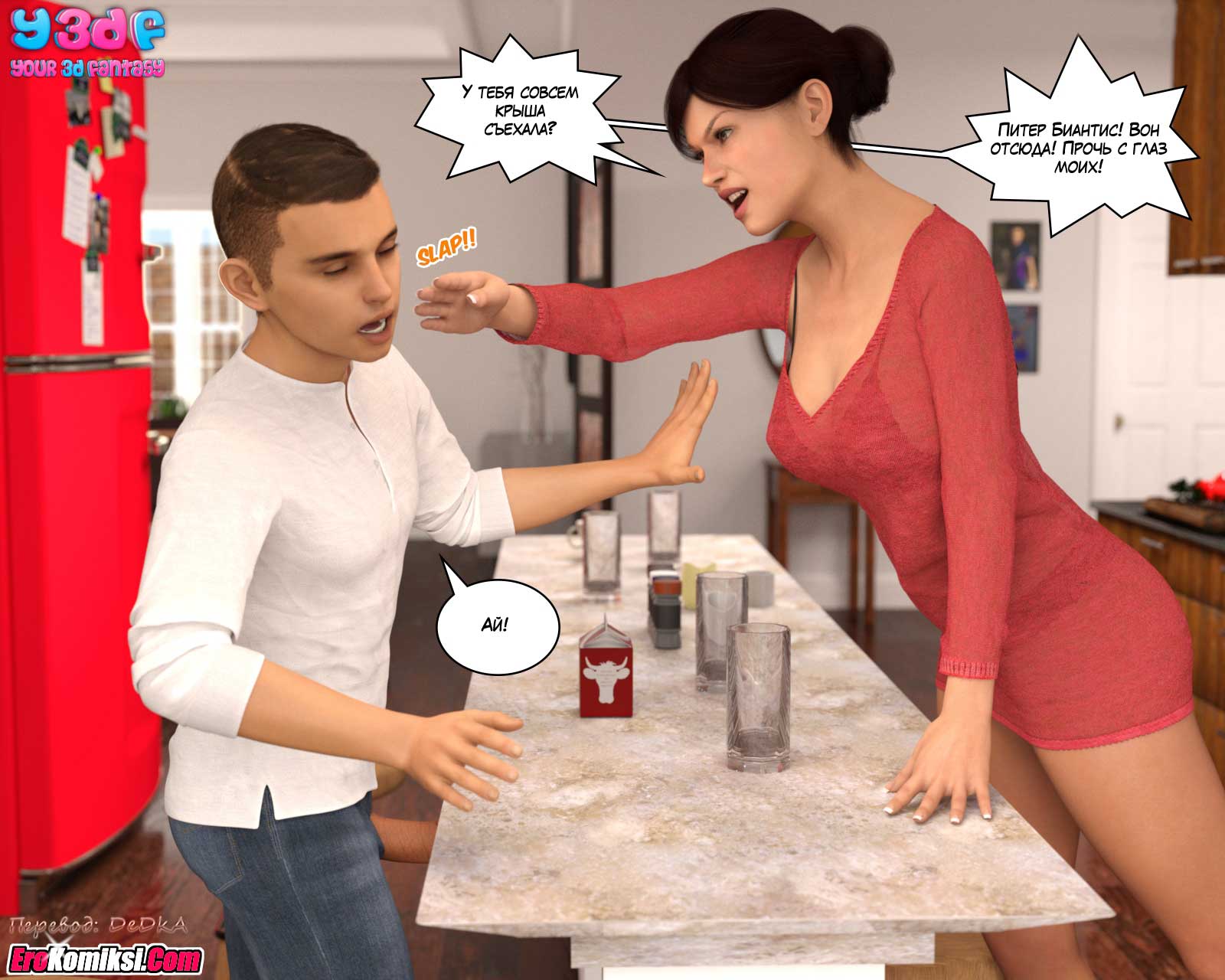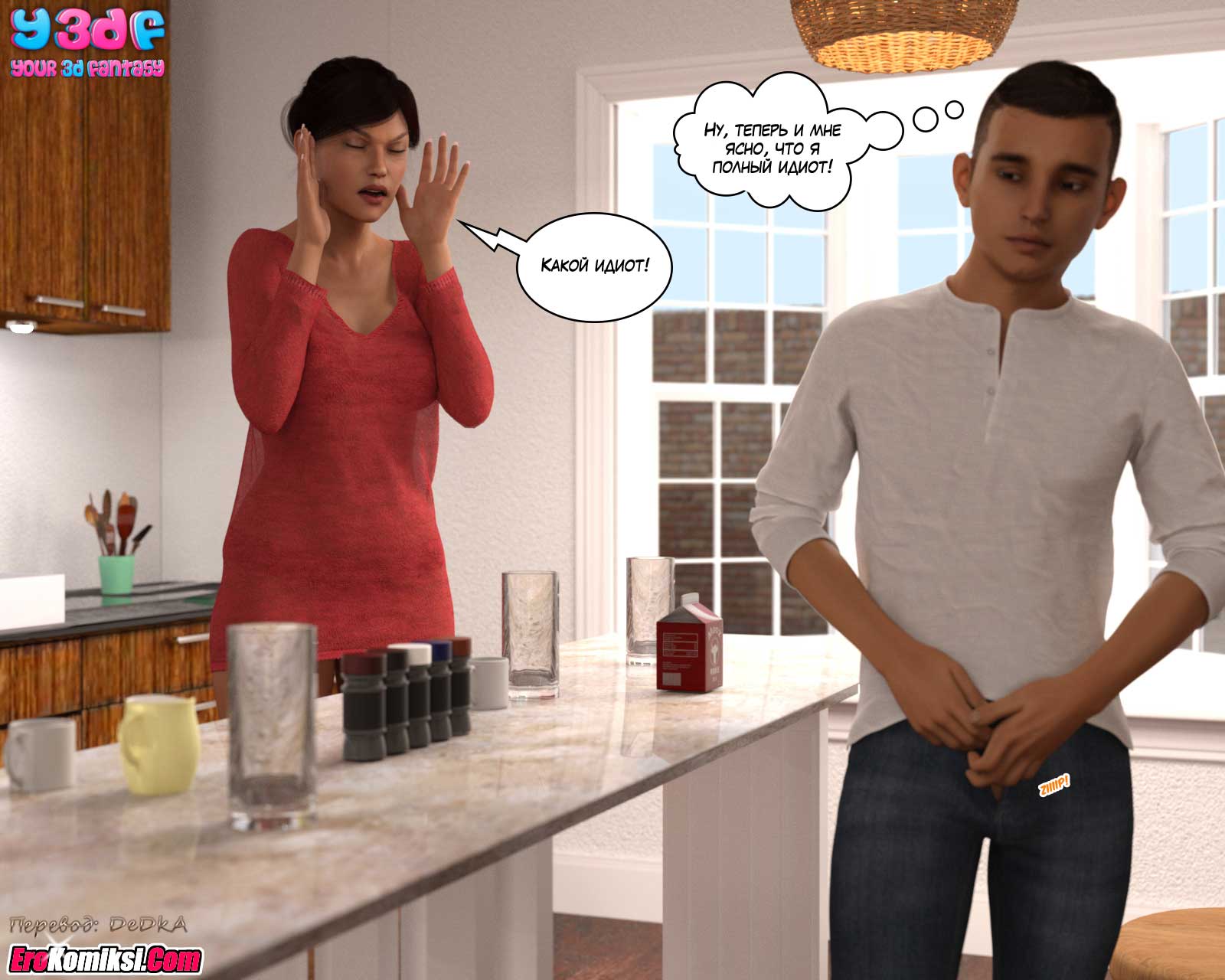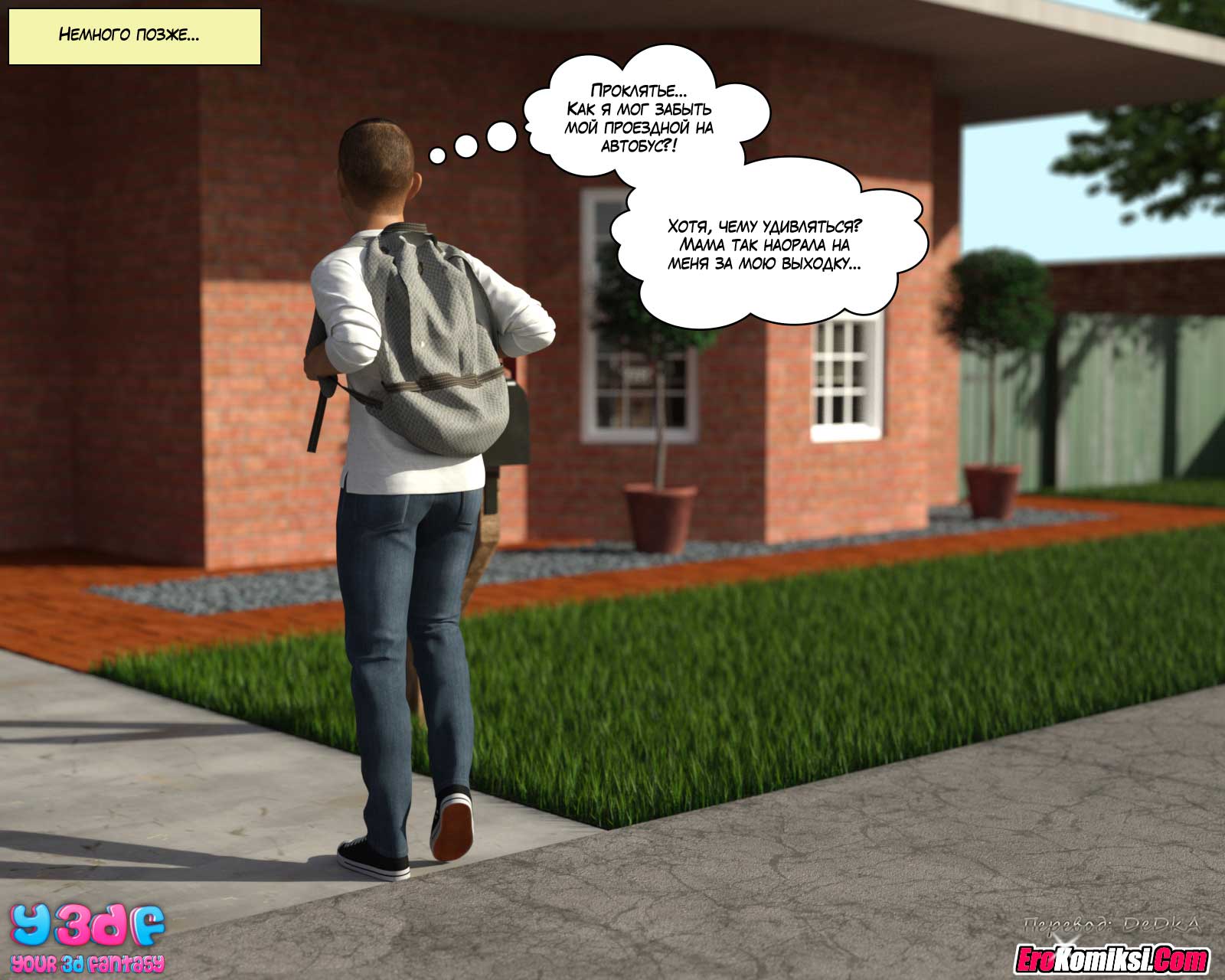 Муж с дочерью уехали на выходные, чтобы посмотреть колледж, в который дочь, возможно, будет поступать. Правда, скорее всего, они уехали трахаться. Но об этом мы узнаем из следующих частей комикса. А из этой части вы узнаете, чем будут заниматься, оставшиеся дома, мать и сын.