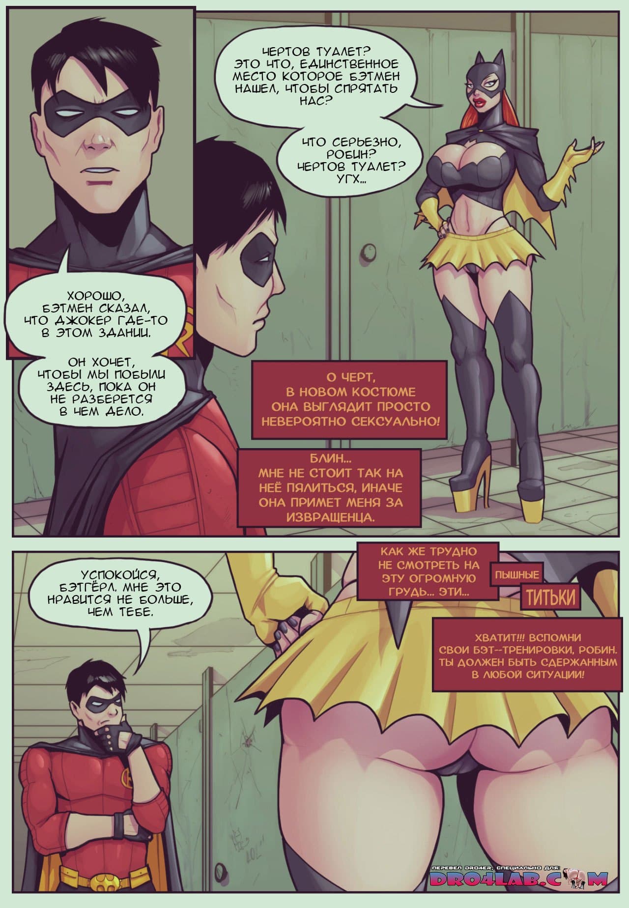 Порно комикс Бэтгерл совратила Робина, поведает вам о том, как Бэтмен велел Робину и большегрудой Бэтгерл затаиться в туалете в одном из зданий, пока он лично будет наводить разборки с Джокером, который не перестает терроризировать Готэм сити. Робин, оставшись один на один с Бэтгерл в очень тесной кабинке туалета, едва сдерживал свои сексуальные взгляды на её аппетитное тело в крайне откровенном костюме. Но Бэтгерл тоже не дура, она все сразу поняла и решила взять ситуацию в свои умелые руки, хотя если быть точным, то в умелый рот…