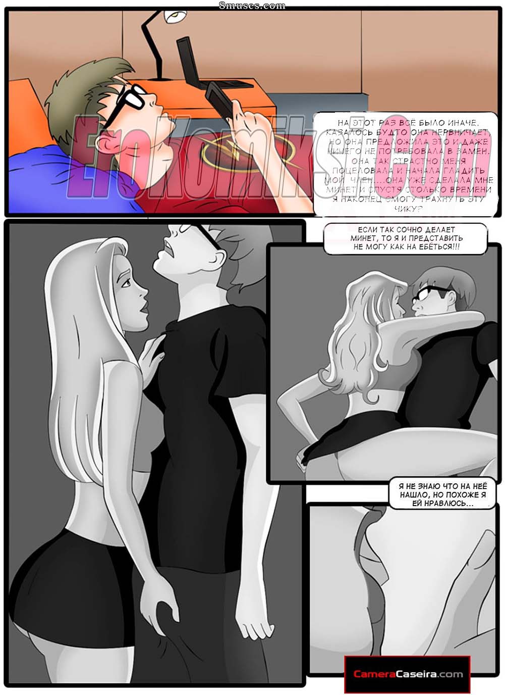 Порно комикс Заводные негры. Часть 7. Cameracaseira Парень решил обсудить с горячей блондинкой все, что между ними было. Она навестила его в сексуальном наряде и сходу стала ласкать его, после чего начала сосать его большой хуй и дала себя хорошенько выебать.