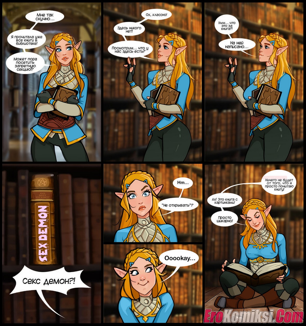 Порно комикс Зельда в библиотеке. Zelda in a library. The Legend of Zelda. Olena Minko Сисястая блондинка Зельда отправилась в запретную секцию в библиотеке, где нашла книгу Секс Демонов. Там она наткнулась на призрака с огромным хуем, который хорошенько выебал ее пизду и задницу.