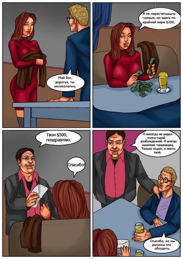 Порно рассказ с картинками,о том, как женщине находящейся замужем приходится танцевать стриптиз в ночном клубе. Ее хотят трахнуть, но она не дает, тогда ее подлавливают на крючок, и большой черный парень устраивает с ней реальное порно, с обильным выплескиванием спермы прямо ей в рот.