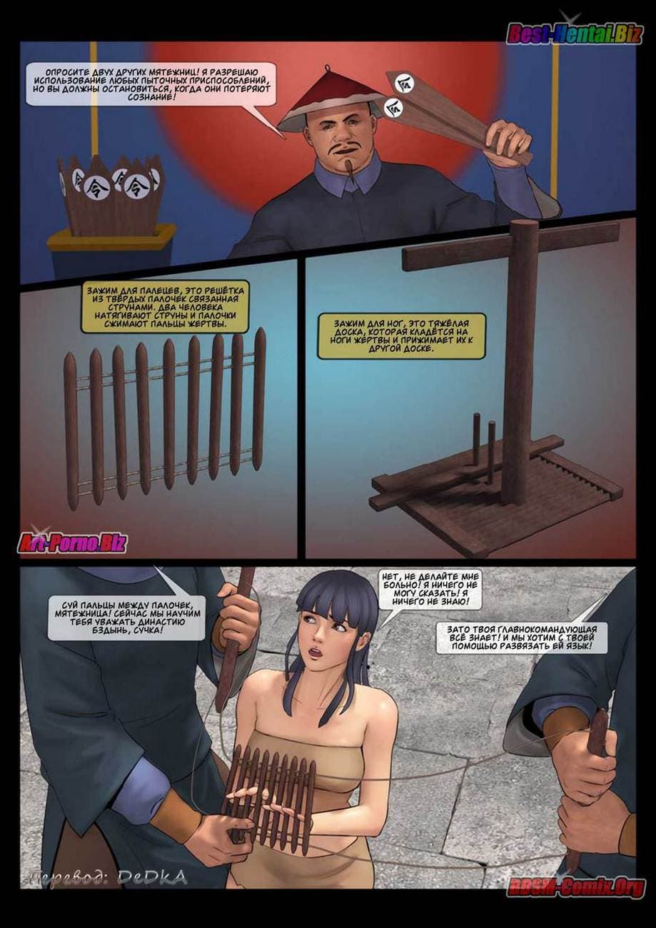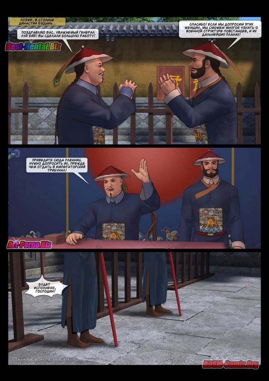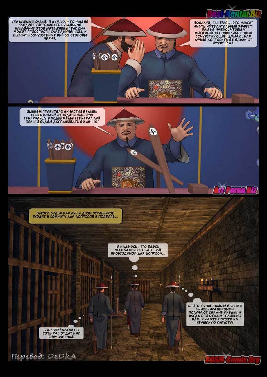 В этой части секс комикса бдсм вы узнаете, как Луй Бяй, коварный военачальник войск династии «Бздынь» захватил командующую хуйпинскими повстанцами. В армии повстанцев женщины служат наравне с мужчинами, и четыре девушки из числа повстанческой армии пленены отрядом похотливых солдат династии. Вместе с ними была захвачена в плен и генеральша Синь Сюянь. Но, где она сейчас и, что с ней делают озабоченные войны противника.