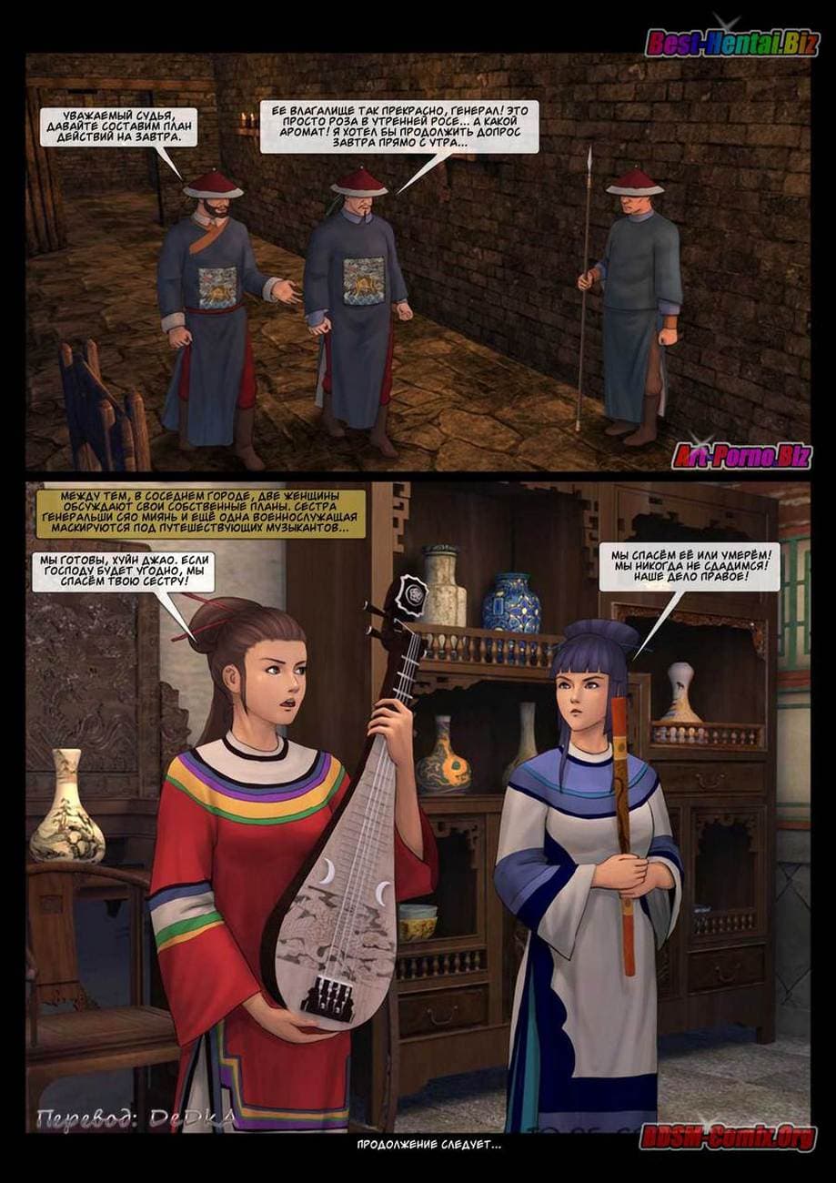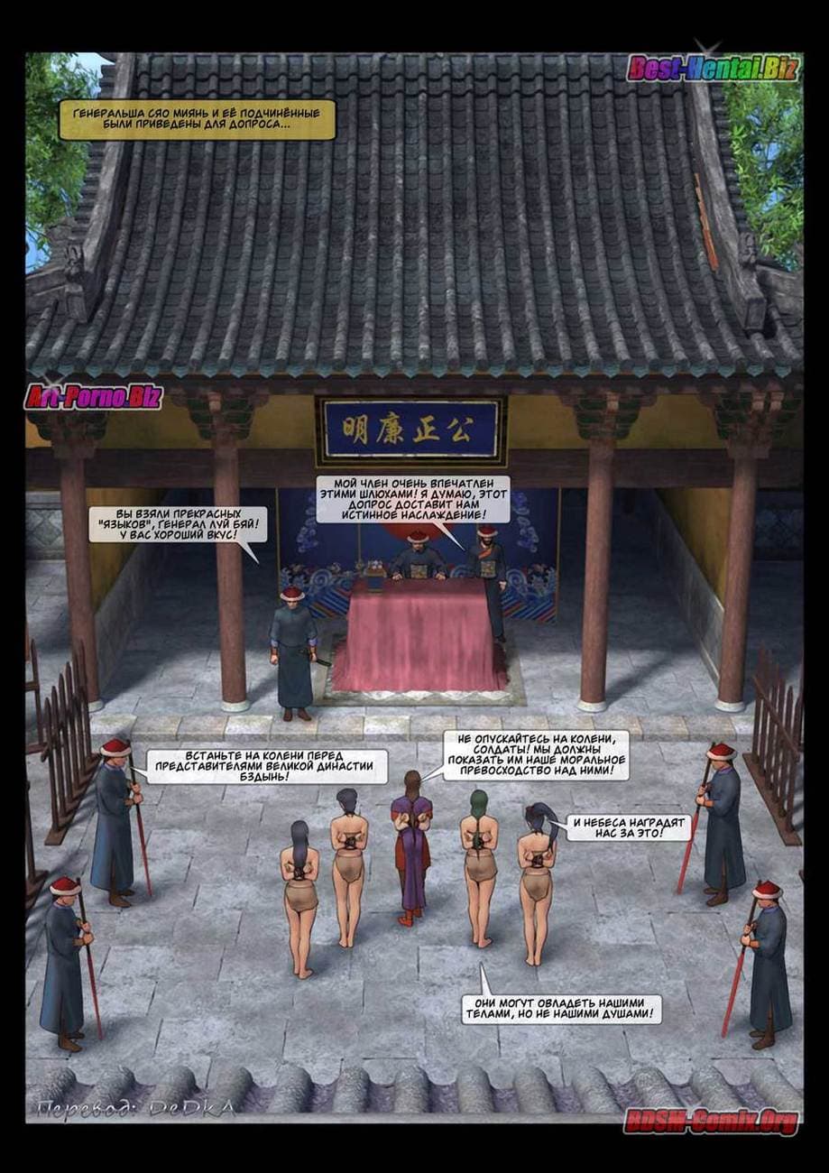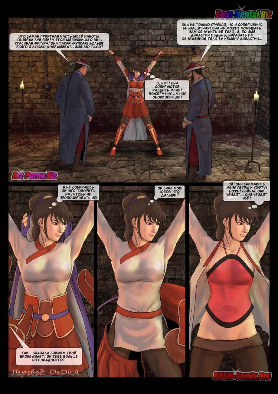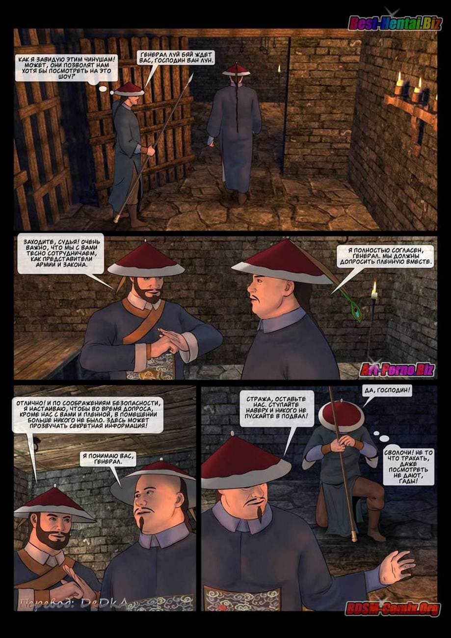 В этой части секс комикса бдсм вы узнаете, как Луй Бяй, коварный военачальник войск династии «Бздынь» захватил командующую хуйпинскими повстанцами. В армии повстанцев женщины служат наравне с мужчинами, и четыре девушки из числа повстанческой армии пленены отрядом похотливых солдат династии. Вместе с ними была захвачена в плен и генеральша Синь Сюянь. Но, где она сейчас и, что с ней делают озабоченные войны противника.