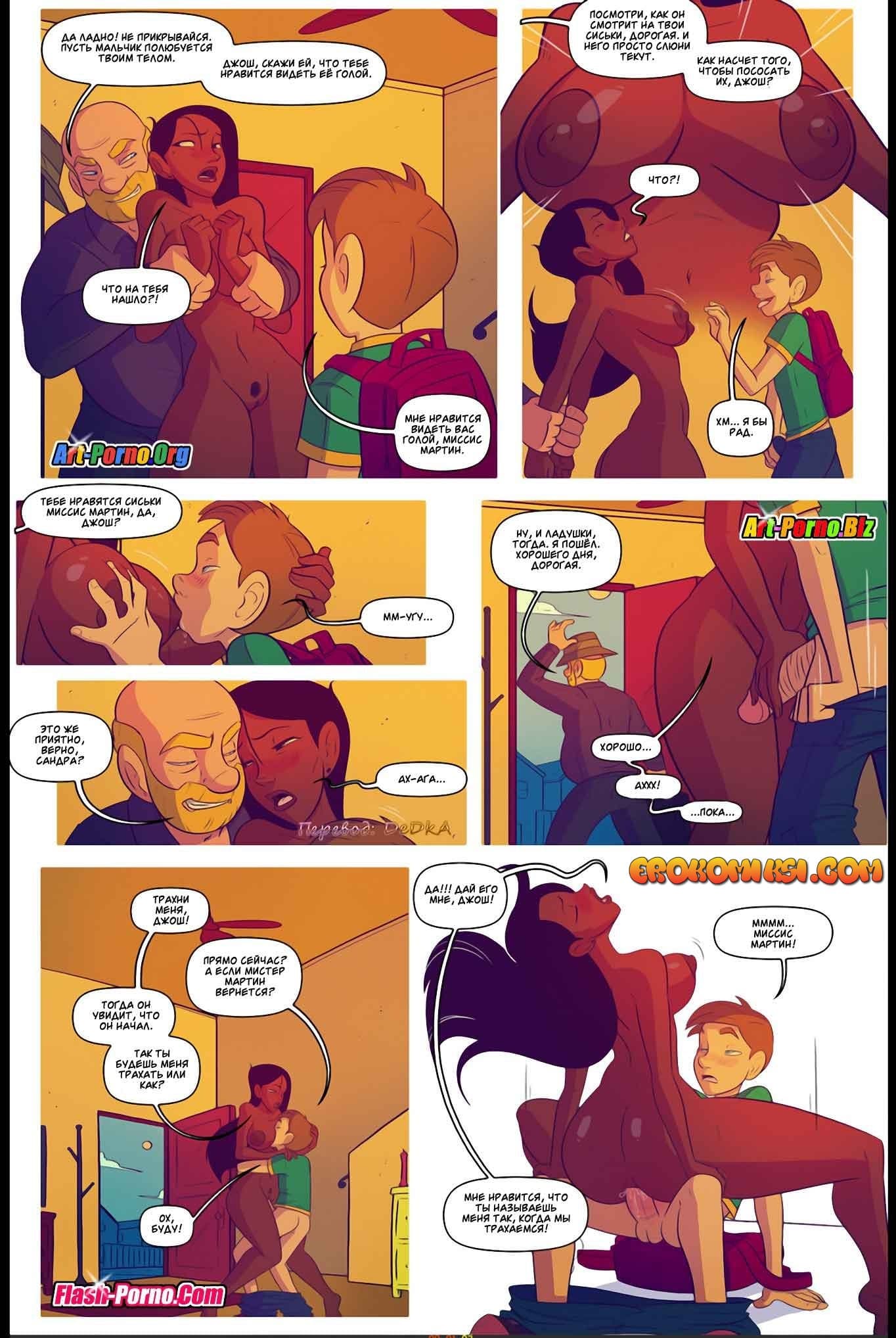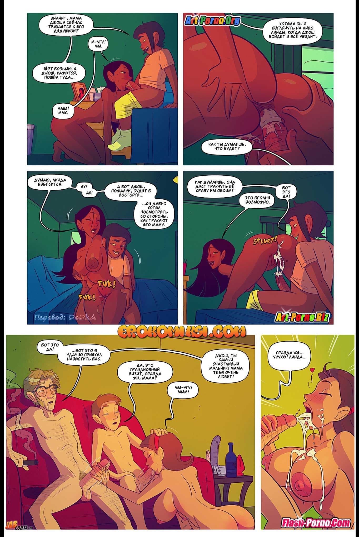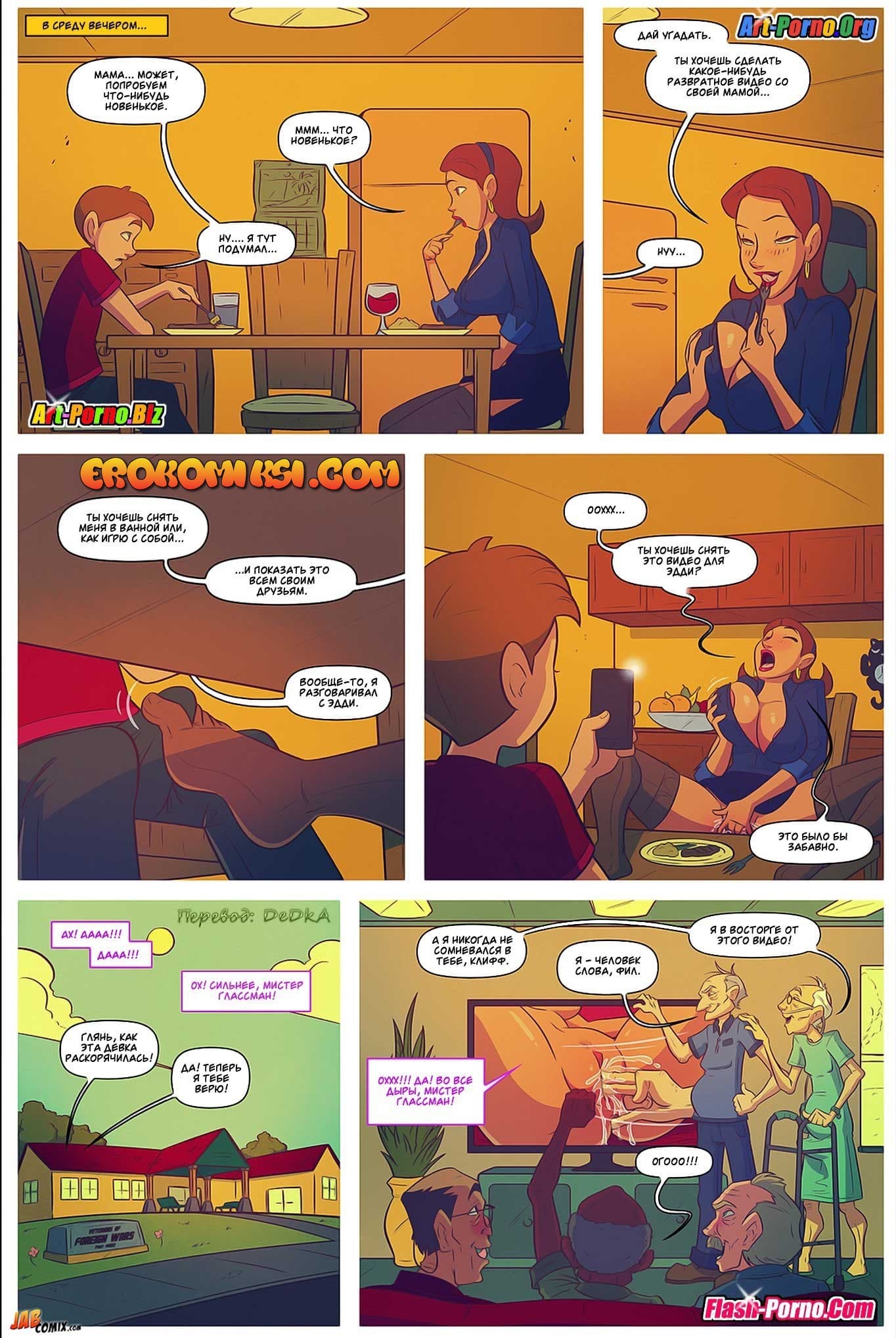 Порно комикс Жить не хуже других 5 часть снова покажет вам продолжение развратной истории. Так Эдди и Джош проснулись утром в субботу после бурной групповой оргии со зрелой мамашей Эдди. Вскоре Джош начал торопливо собираться домой, ведь он хотел еще успеть «отыметь» свою мамашу, пока его дед не проснулся. Но, как оказалось, женщина уже с раннего утра во всю развлекалась со своим папашей, и была уверена, что Джош не вернется так рано, потому что она обращалась с просьбой к маме Эдди задержать его до самого обеда…