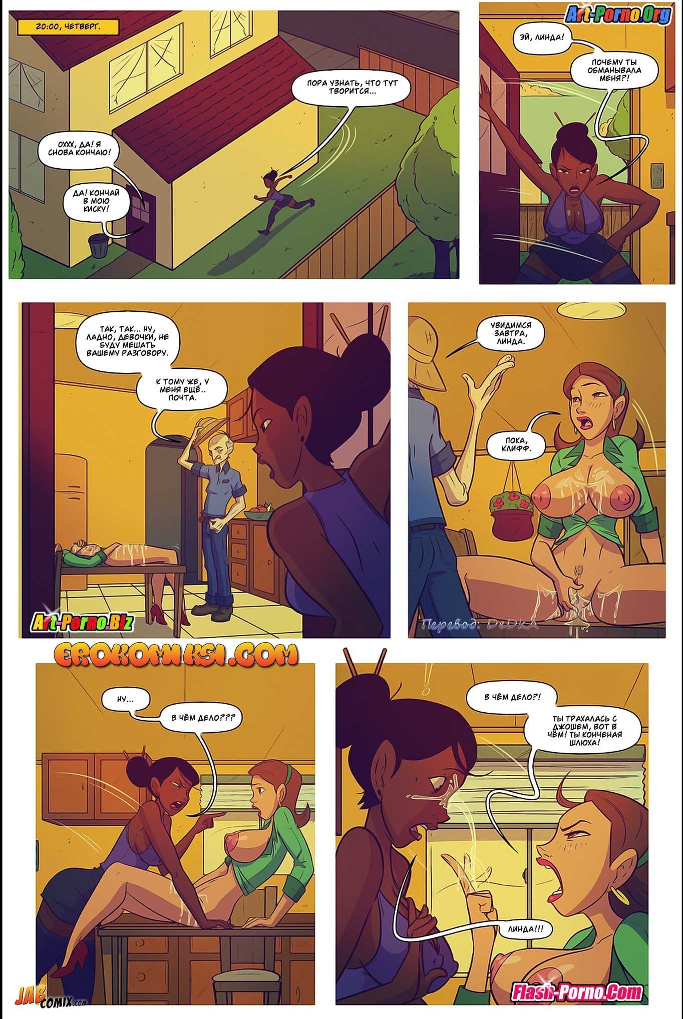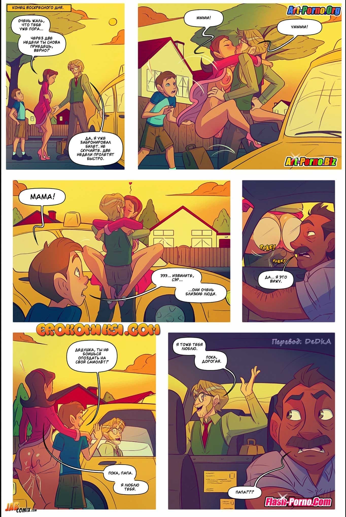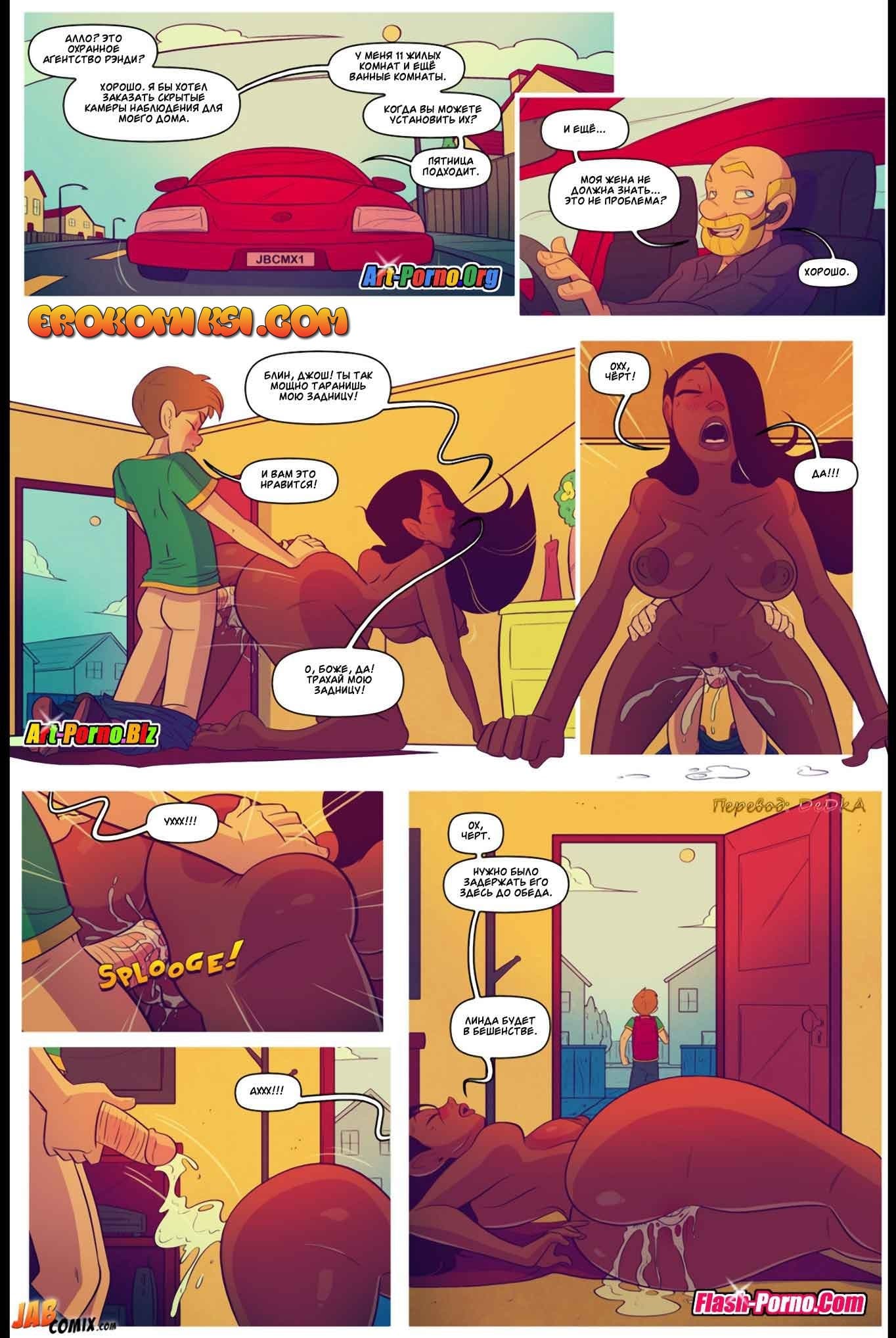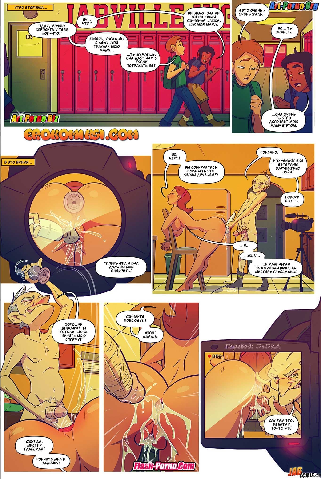 Порно комикс Жить не хуже других 5 часть снова покажет вам продолжение развратной истории. Так Эдди и Джош проснулись утром в субботу после бурной групповой оргии со зрелой мамашей Эдди. Вскоре Джош начал торопливо собираться домой, ведь он хотел еще успеть «отыметь» свою мамашу, пока его дед не проснулся. Но, как оказалось, женщина уже с раннего утра во всю развлекалась со своим папашей, и была уверена, что Джош не вернется так рано, потому что она обращалась с просьбой к маме Эдди задержать его до самого обеда…