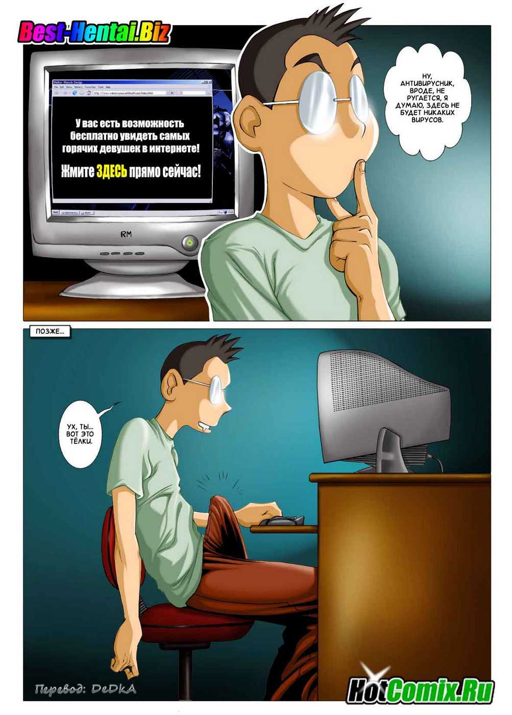 Возбуждающие эротические рисунки в развратном порно комиксе о пацане, увлеченном компьютером. Ему для полноценной жизни не хватало одного: хорошей телки для снятия, переполняющей его похоти. В очередной раз он присел за экран монитора, чтобы насладиться видом голых виртуальных женщин, и о чудо…