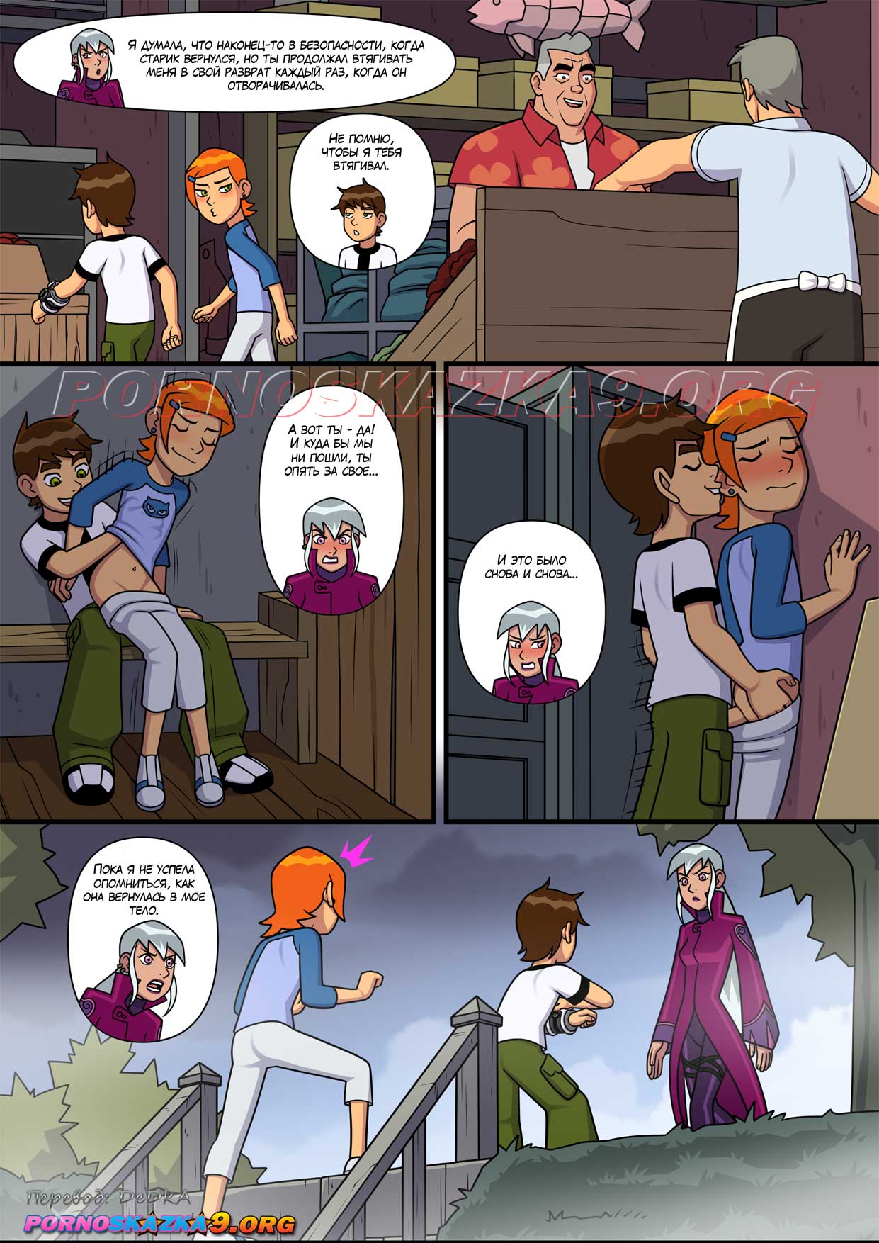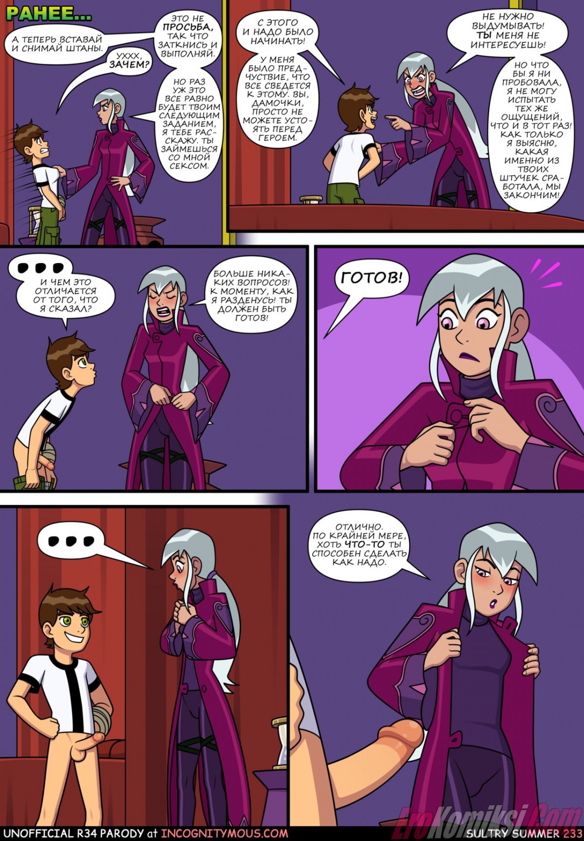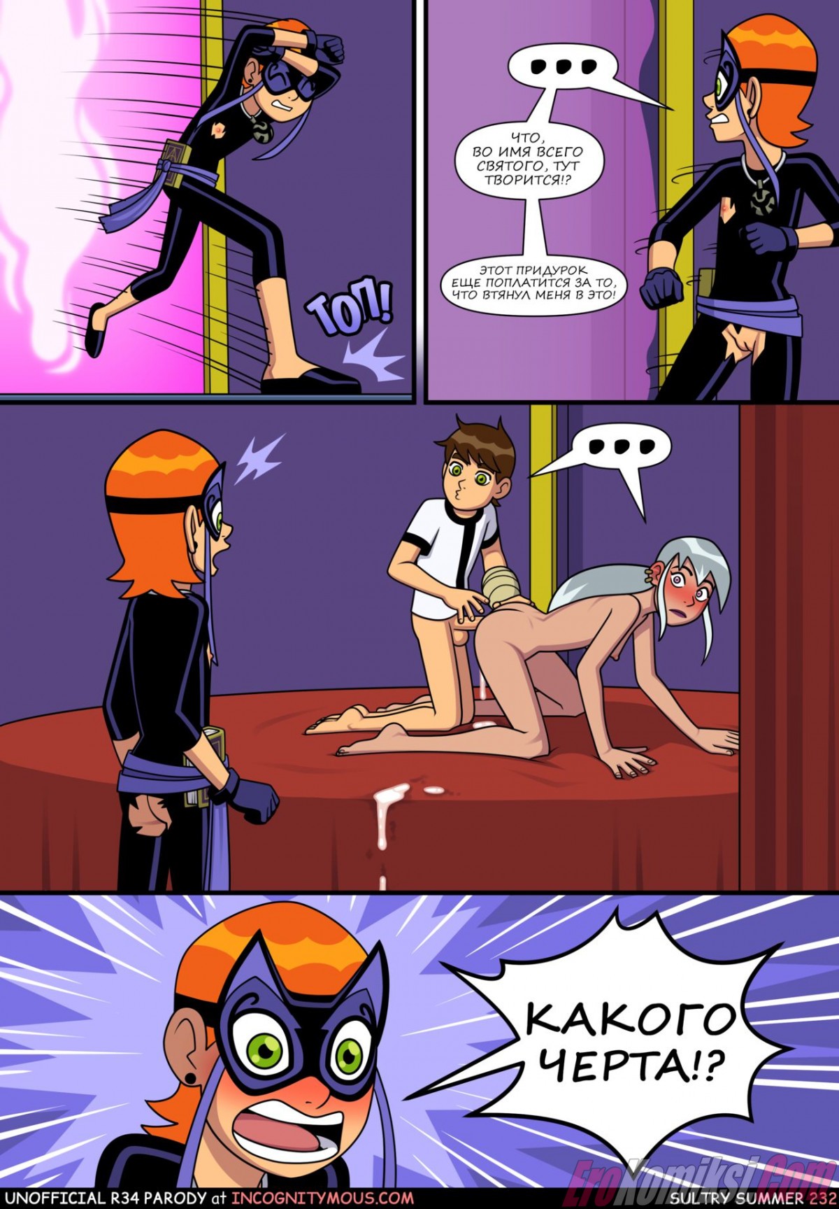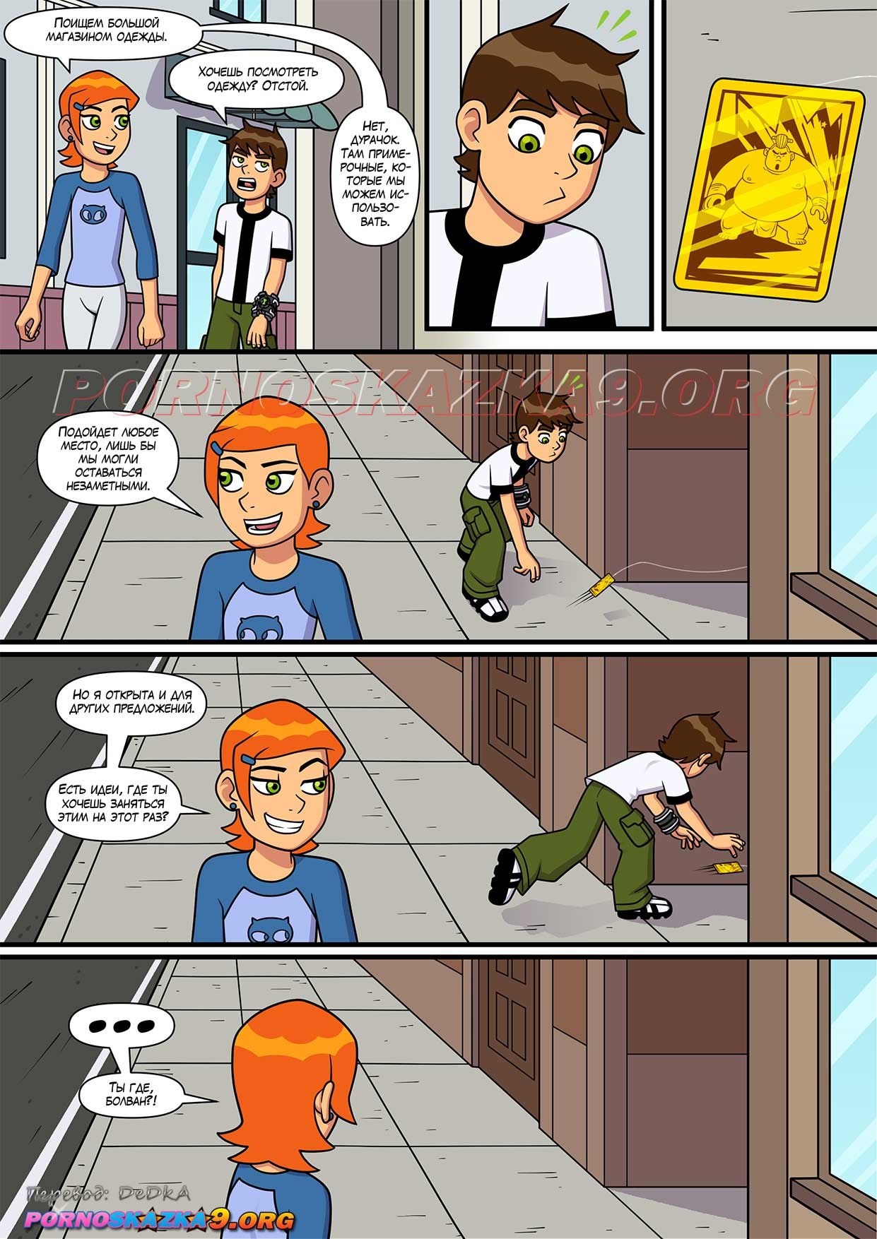 Порно комикс Знойное лето. Часть 6. Бен гулял по улице с Гвен и внезапно чертовски возбудился. Он завел девушку в переулок, чтобы повеселиться с ней. Он поставил сучку раком и хорошенько ее выебал, кончив ей в киску.