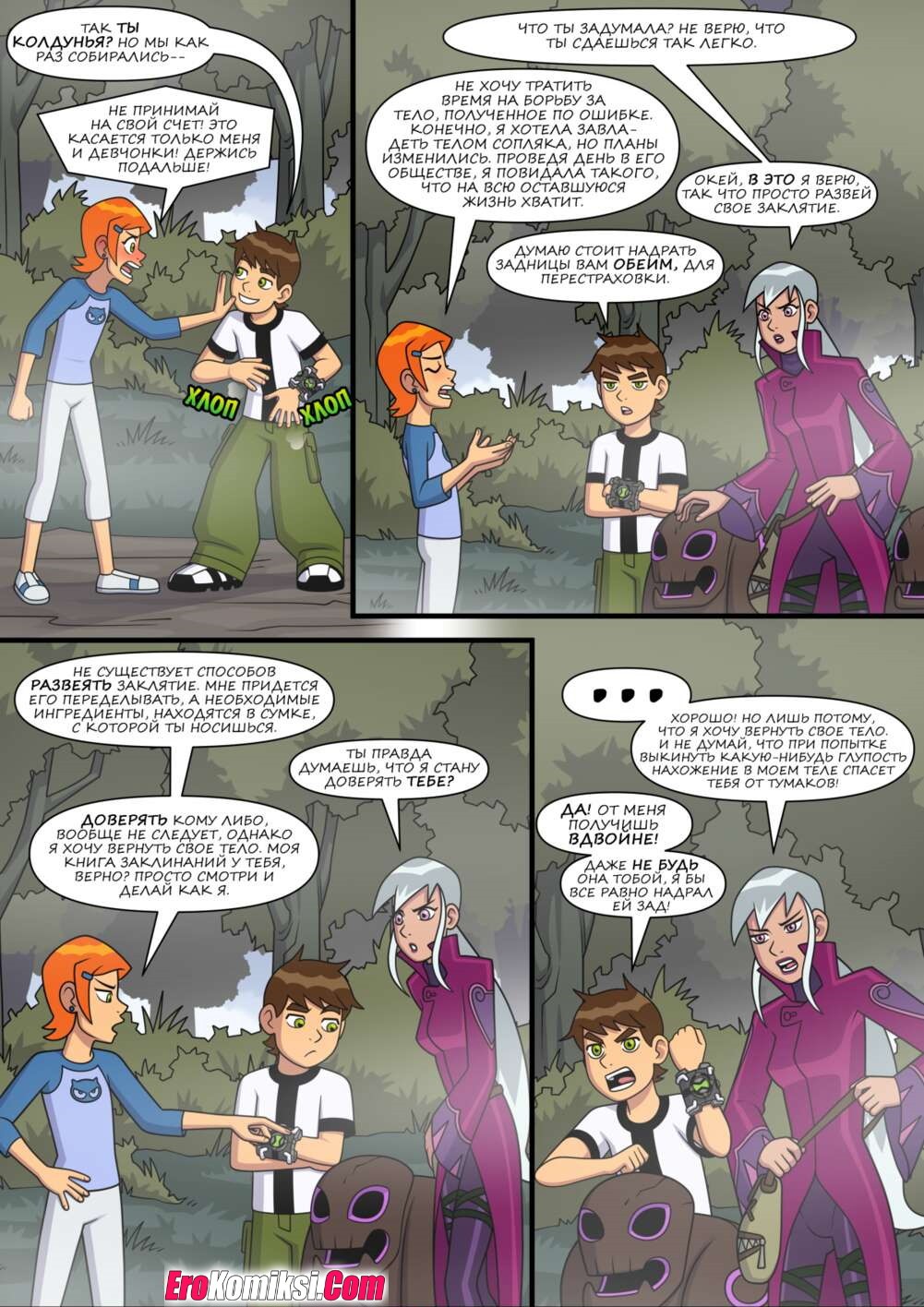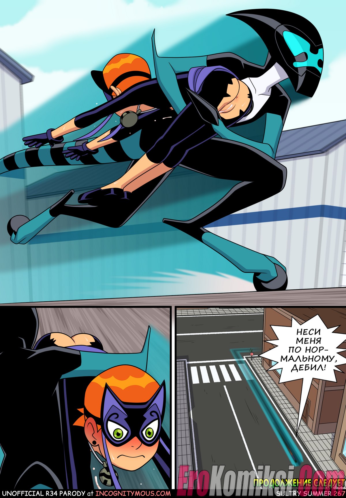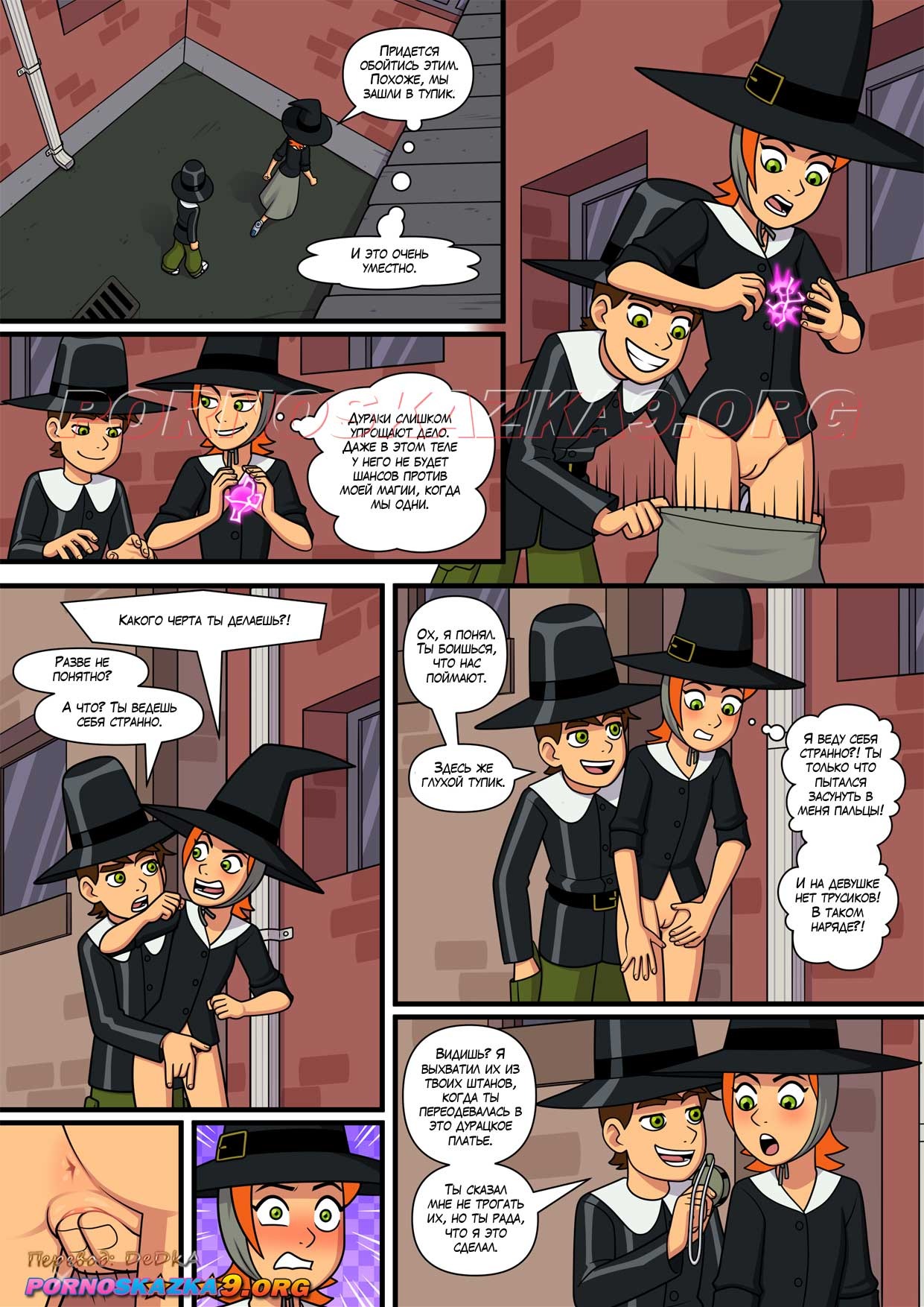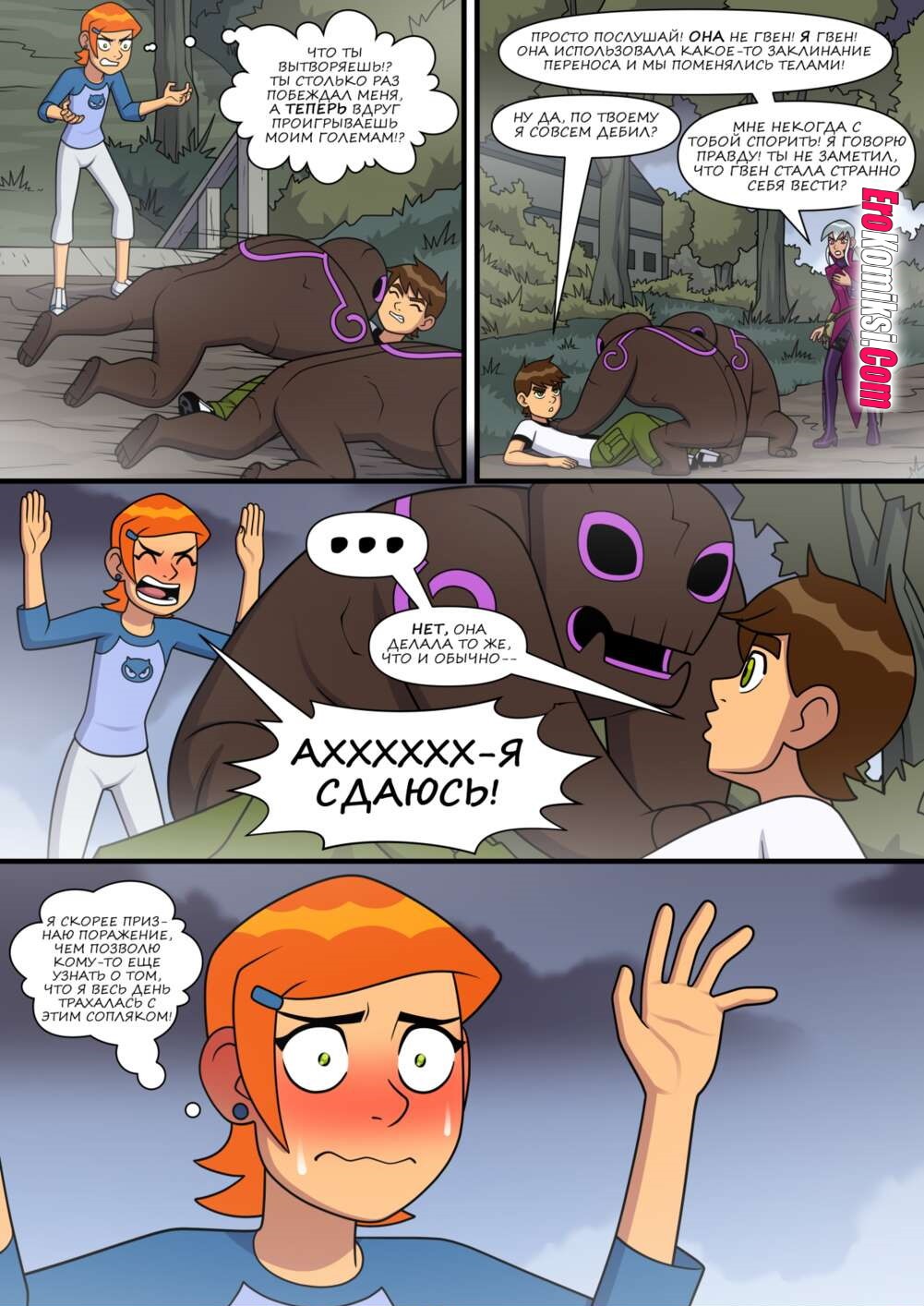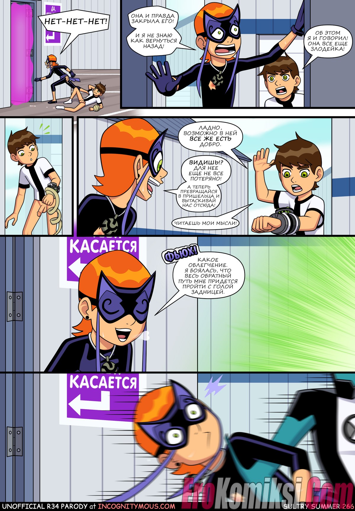 Порно комикс Знойное лето. Часть 6. Бен гулял по улице с Гвен и внезапно чертовски возбудился. Он завел девушку в переулок, чтобы повеселиться с ней. Он поставил сучку раком и хорошенько ее выебал, кончив ей в киску.