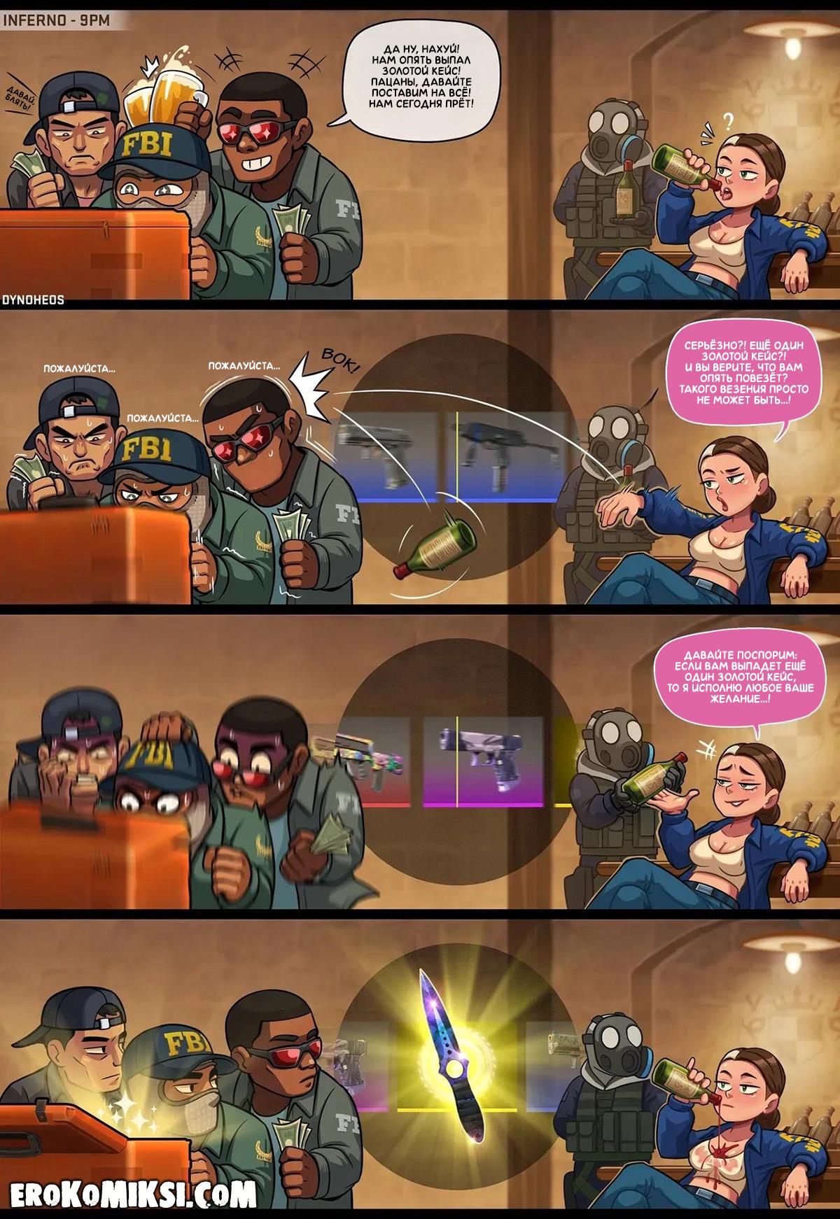 Порно комикс Золотой кейс Авы. Ава поспорила со своими дружками, что если у них выпадет ещё один золотой кейс, то она исполнит любое их желание, и как на зло, парням повезло, поэтому Аве пришлось обслуживать четыре твёрдых члена своими тугими дырочками…