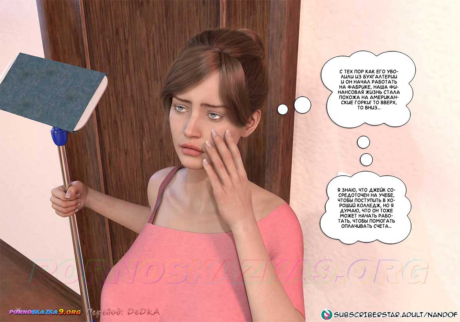 Порно комиксы Онлифанс мамы. Часть 1. На фабрике, где работает Макс, дела идут плохо, ему грозит увольнение. Жена Макса подумывает о том, чтобы поискать работу на неполный рабочий день, а еще она думает, что их с Максом сын, Джейк, который готовится к поступлению в колледж, тоже мог бы начать работать, но у Джейка совсем другое на уме…