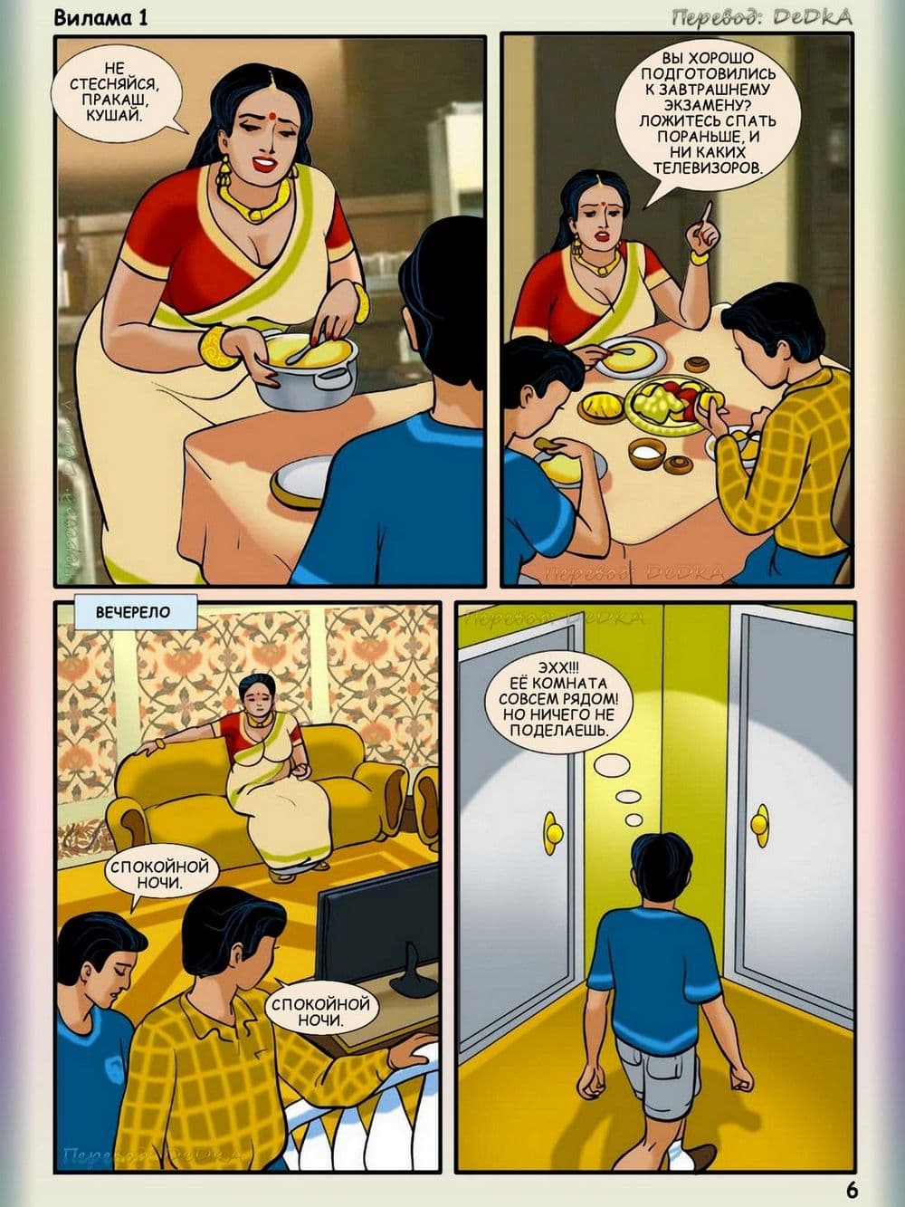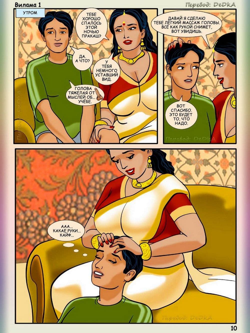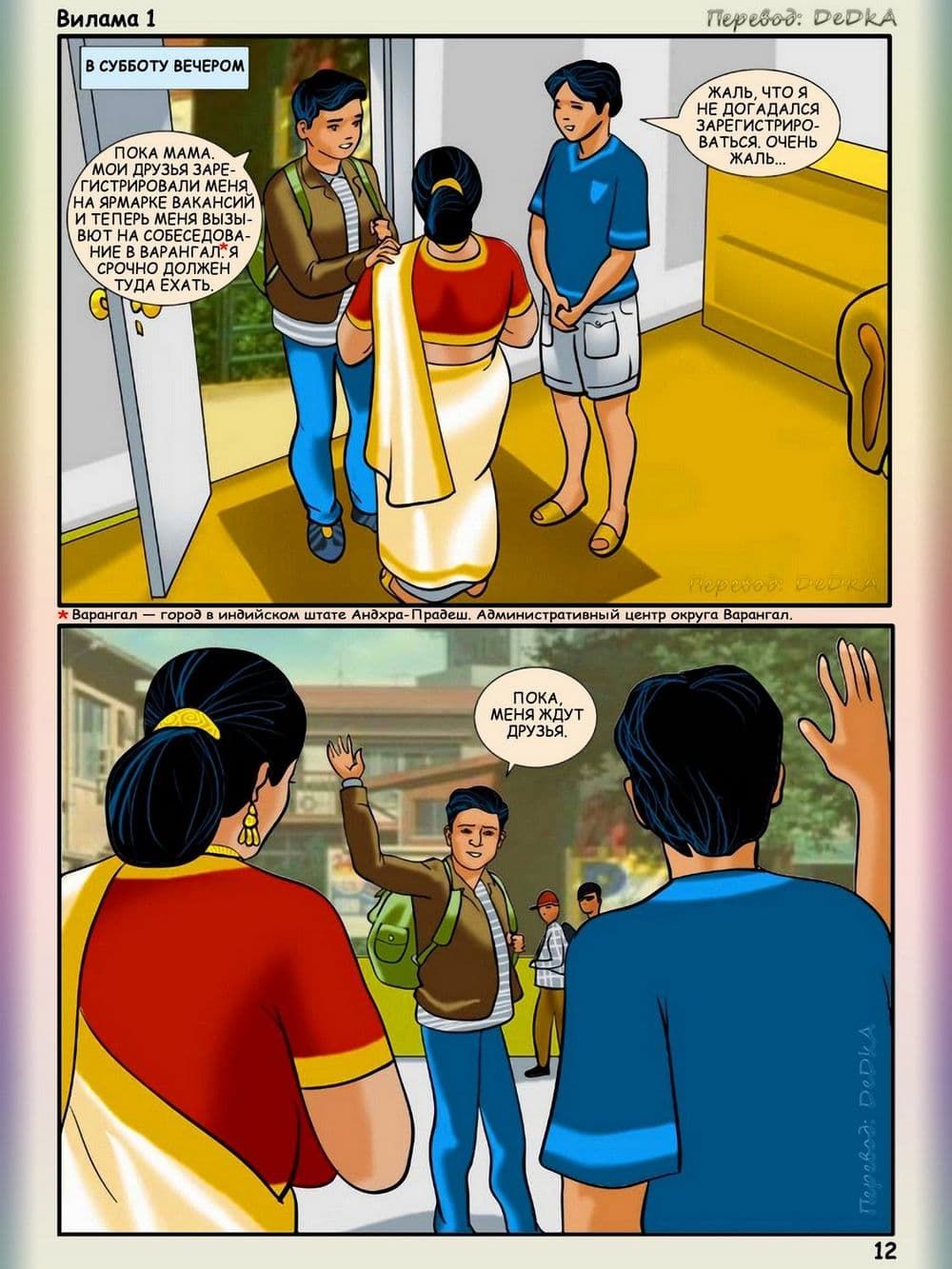 Вся история порнокомикса Вилама Лакшми начиналась с того, что сын Виламы заканчивал школу и у него через несколько дней должны будут состоятся экзамены. Вместе с этим к ним приехал сын их друзей по имени Пракаш, он такой же будущий студент, который не только будет проводить все свое свободное время в гостях у семьи Лакшми в титанической учебе, но и захочет постараться соблазнить аппетитную и грудастую, добрейшей души женщину, а также завалить ее в мягкую постель. Наивная взрослая женщина в добром порыве всеми силами старается помочь молодому парню, а тот старается сблизиться с хозяйкой, и тут случай дает возможность для реализации его коварного сексуального плана.