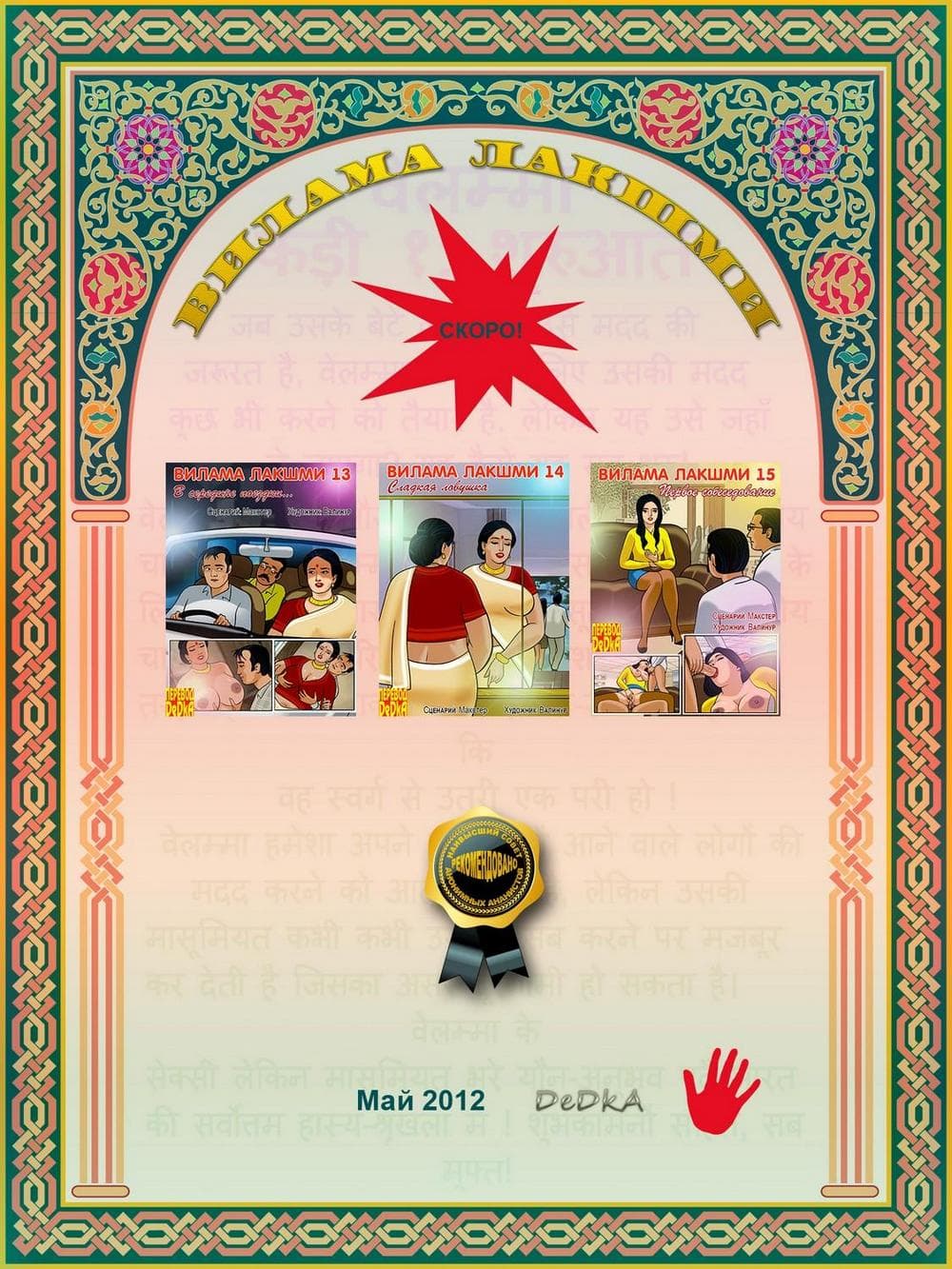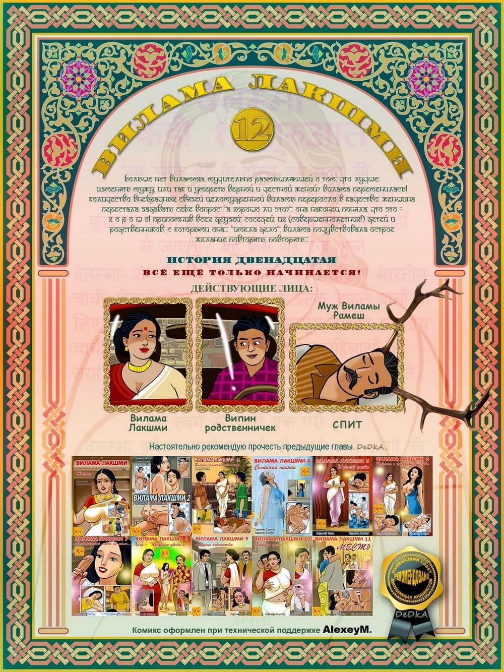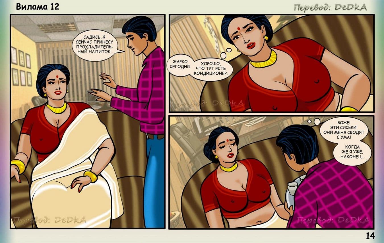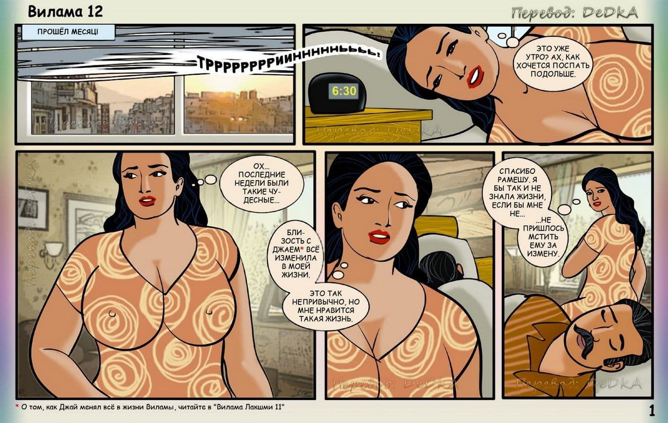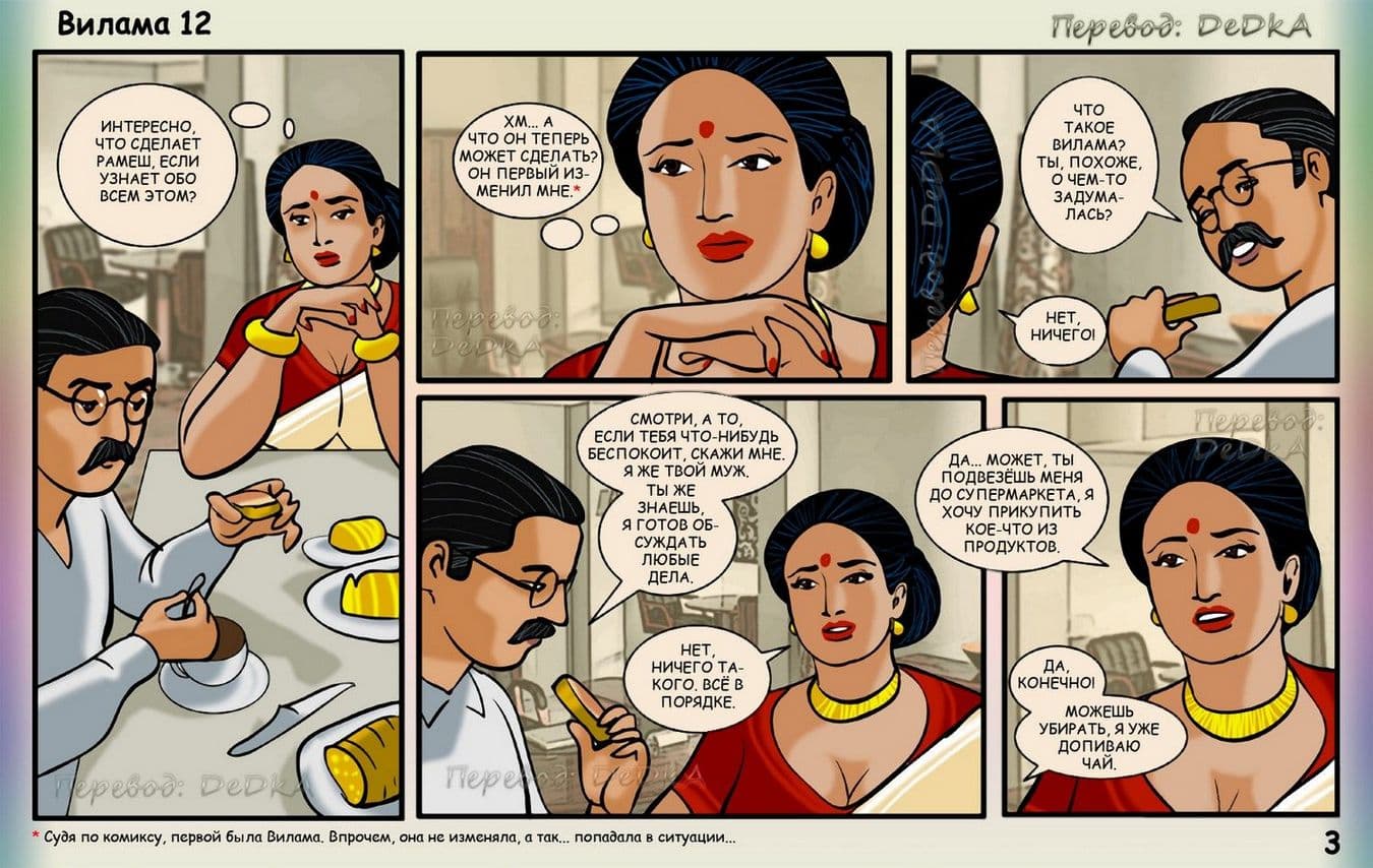 В данном комикс 18 плюс о Виламе Лакшми речь пойдет о том, как наша зрелая героиня, наконец стала в полной мере наслаждаться своей жизнью, особенно в интимном отношении. После того, как она узнала об измене своего мужа, ее уже не мучает совесть, по поводу того, что она трахается с Джаем. Сегодня зрелая женщина решила пройтись по магазину, где случайно встретилась с Випином. Увидев ее, Випин сразу стал думать об одном, как бы развести порядочную женщину на очередной секс. Он делает двусмысленный намек Виламе, приглашая ее к себе домой. На удивление большегрудая добрая героиня сразу соглашается. У Випина от предвкушения полового удовольствия чуть не порвались штаны. Все чего он хочет – это мять большие сиськи Виламы и вонзать в нее свой молодой член.