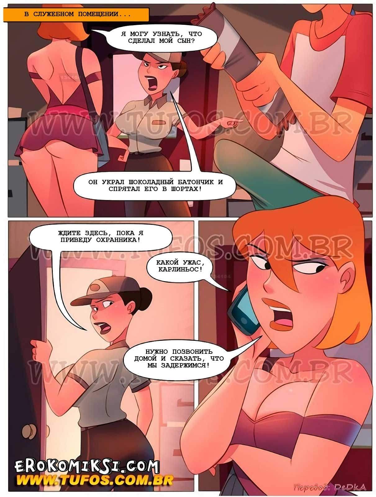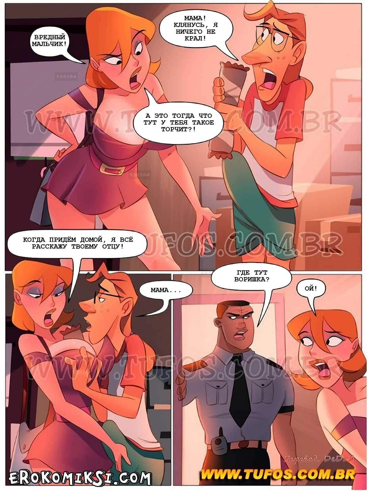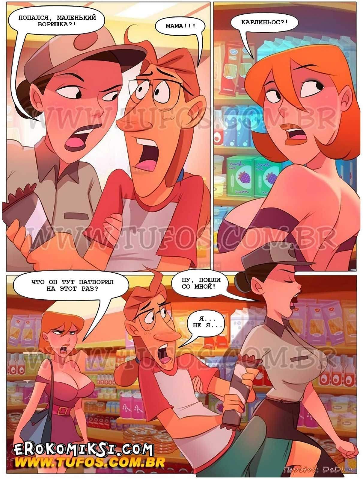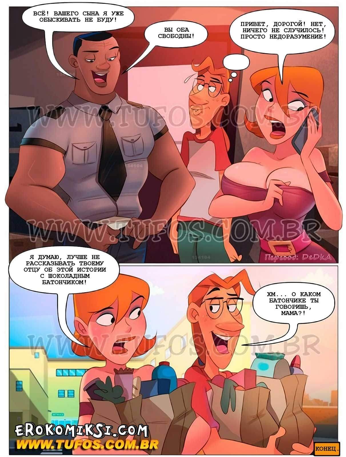 Пошлый комикс Похотливая семейка часть 32 расскажет, как Мария решила закупить продукты на месяц и взяла с собой в супермаркет Карлиньоса. В супермаркете было так много сексуальных домохозяек, что у Карлиньоса в шортах кое-что сильно оттопырилось! Увидев бугор в шортах покупателя, охрана магазина решила, что он спёр и спрятал в шорты шоколадный батончик. Карлиньоса вместе с мамашей отвели в служебное помещение для обыска, где чернокожий громила почему-то сначала решил проверить своим членом не спрятано ли что-либо в вагине мамы Карлиньоса…
