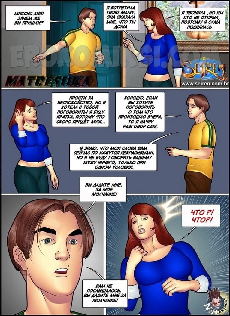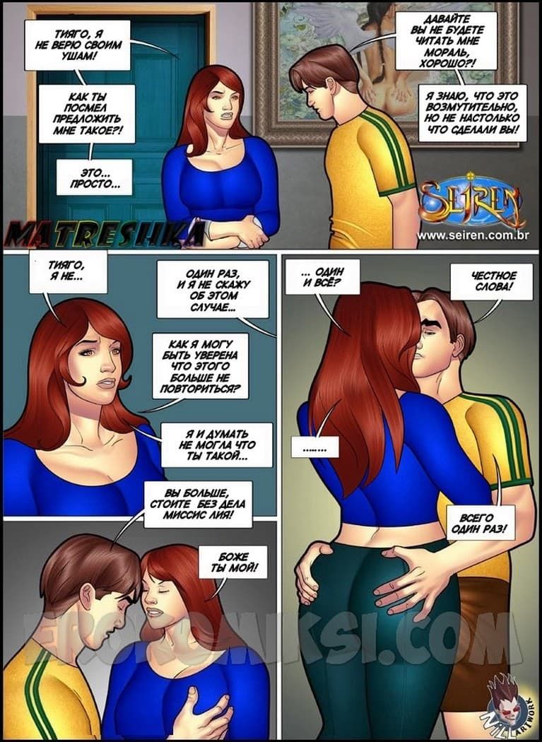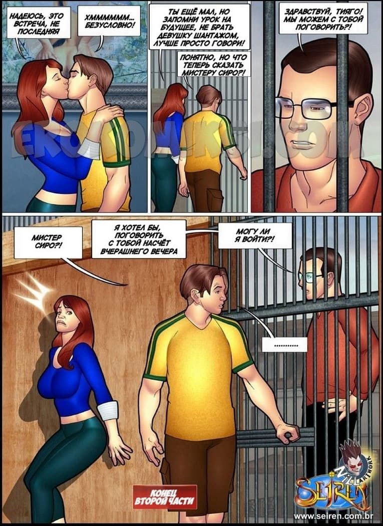 Как всегда на нашем сайте самые пошлые комиксы. Во второй части данной истории все начинается с того, что Тияго остается дома один и решает помастурбировать на недавнюю сцену измены с Лии с другим мужиком. Теперь Тияго мечтает об одном – трахнуть неверную женушку мистера Сиро. И только он принялся дрочить, как к нему домой пришла она – Лия. Женщина хочет, чтобы парень держал язык за зубами по поводу ее сексуальных похождении. Тияго согласен, но у него есть жесткое условие. Он хочет прямо здесь и сейчас выебать Лию…
