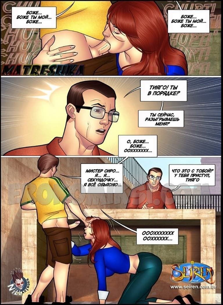 Вот и следующая часть секс эрокомикса, рассказывающая о похождениях Лии. В данном сюжете к Тияго домой приходит Сиро за объяснениями по поводу того, что он так резко сбежал вчера с работы. В это время у Тияго находится Лия, которая прячется от мужа. Но в какой – то момент она перестала бояться, и не обращая внимания на присутствие супруга стала сосать твердый член похотливого Тияго.