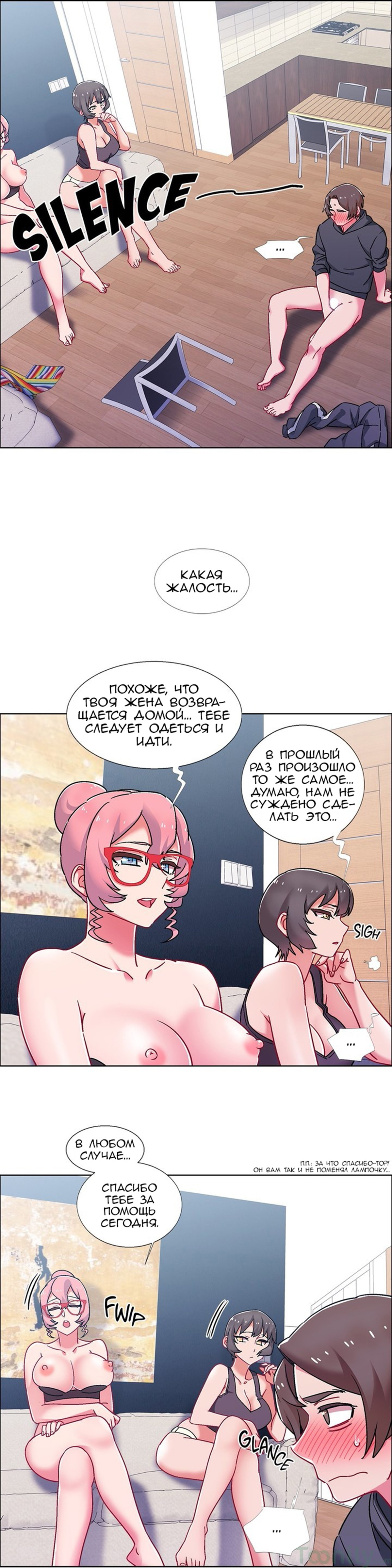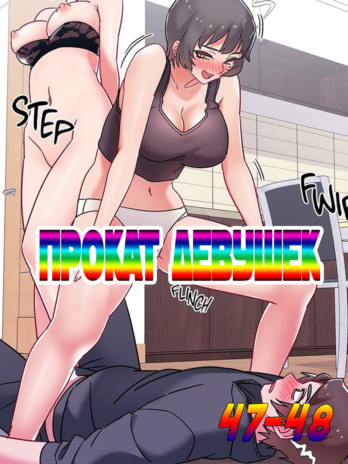 Порно комикс Прокат девушек. Часть 47-48. Rental Girls. Парень помогает женщине вкрутить лампочку, она забралась на стул, а он схватился за ее попку и следит чтобы она не упала. Пришло время опускать ее, он парень так замечтался как бы он трахнул эту сочную попку, что не слышал ничего вокруг.