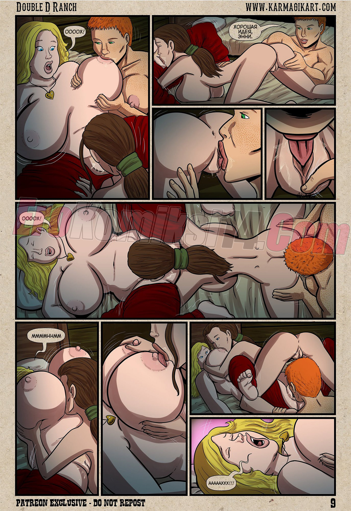 Порно комикс Ранчо Дабл Д. The Cowgirls Of The Double D Ranch. Karmagik Во время ночной грозы две парочки сисястых лесбиянок решили повеселиться. Они стали ласкать друг дружке пизду, а затем стали ебаться с помощью своих секс игрушек.