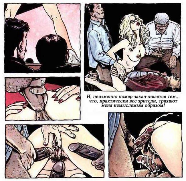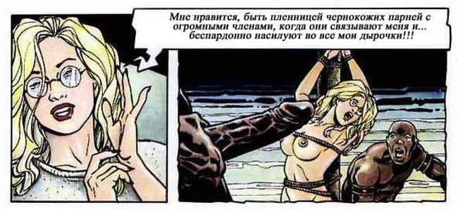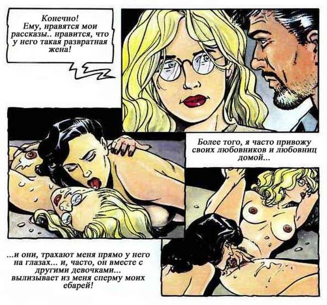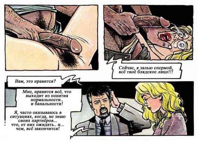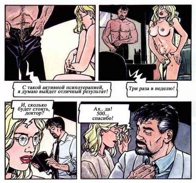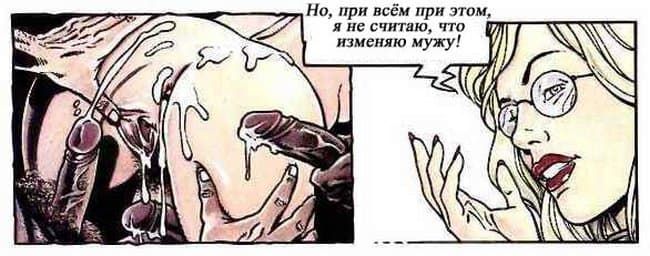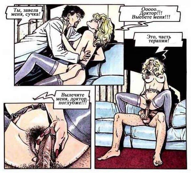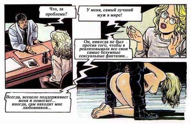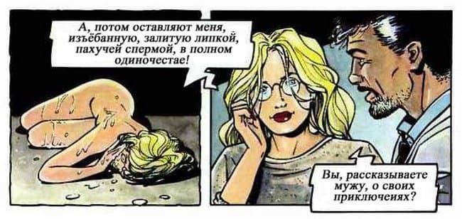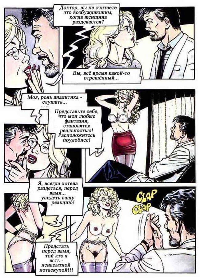 В этом порно комиксе женщина рассказывает своему психоаналитику о своей интимной жизни. Чем больше она говорит, тем яснее становится, что перед нами конченая блядь. Ей только и нужно, чтобы ее бесцеремонно трахали во все ее щели и всячески ублажали, другого ей и не нужно.