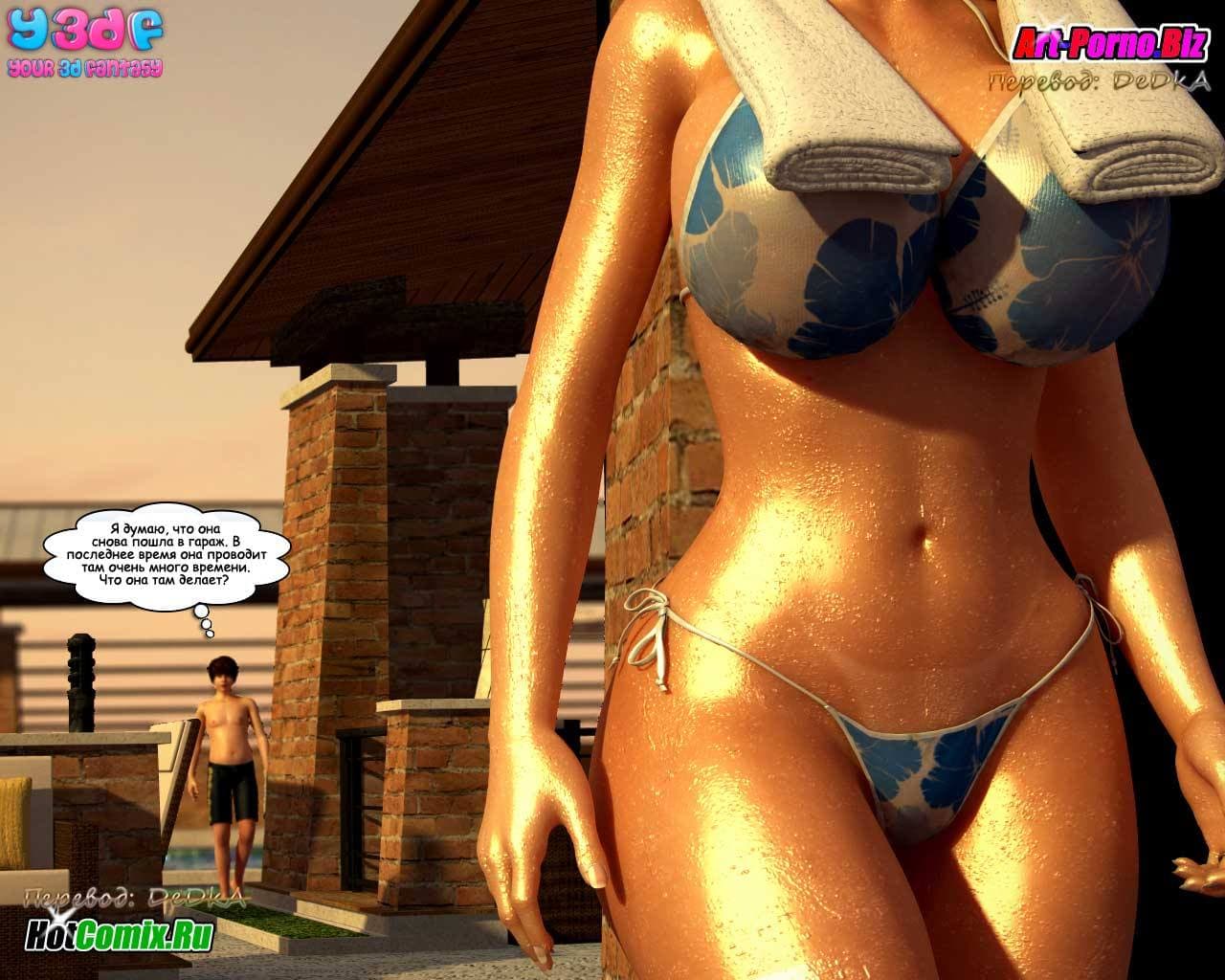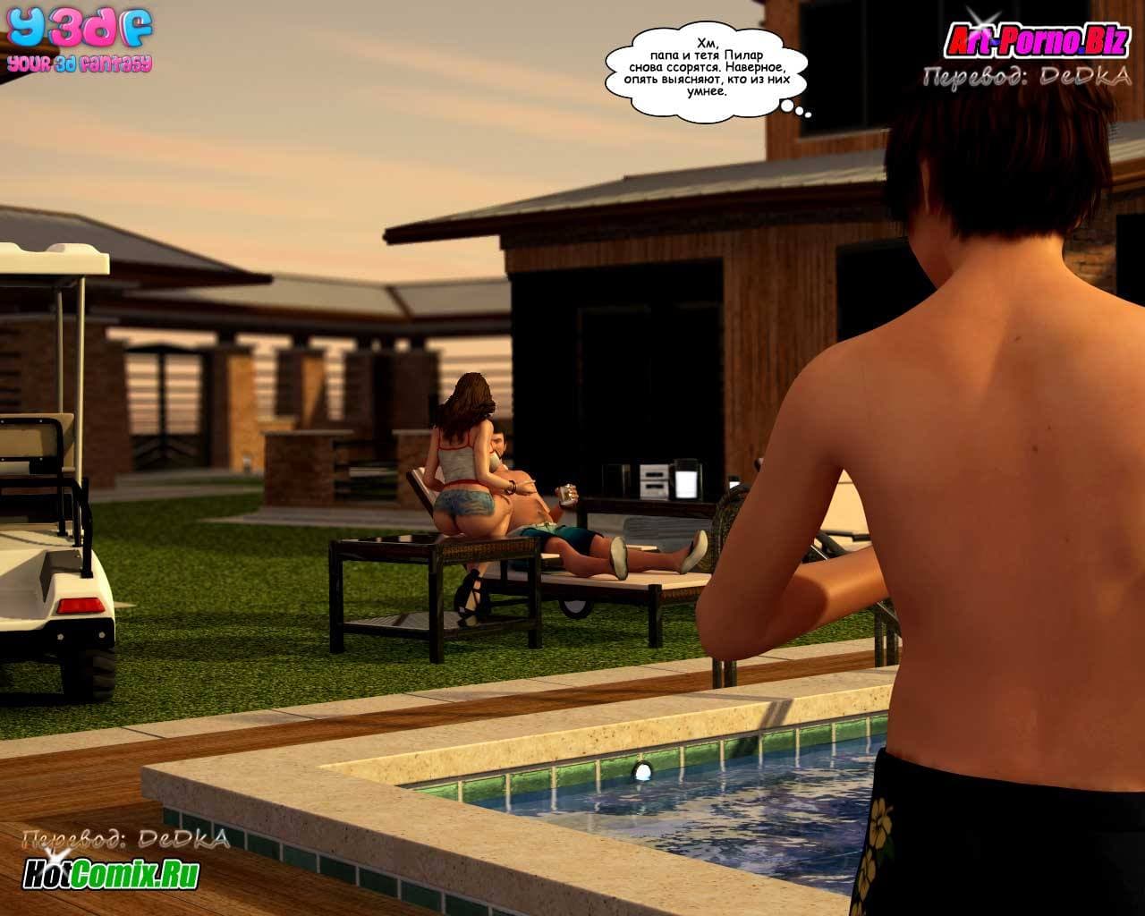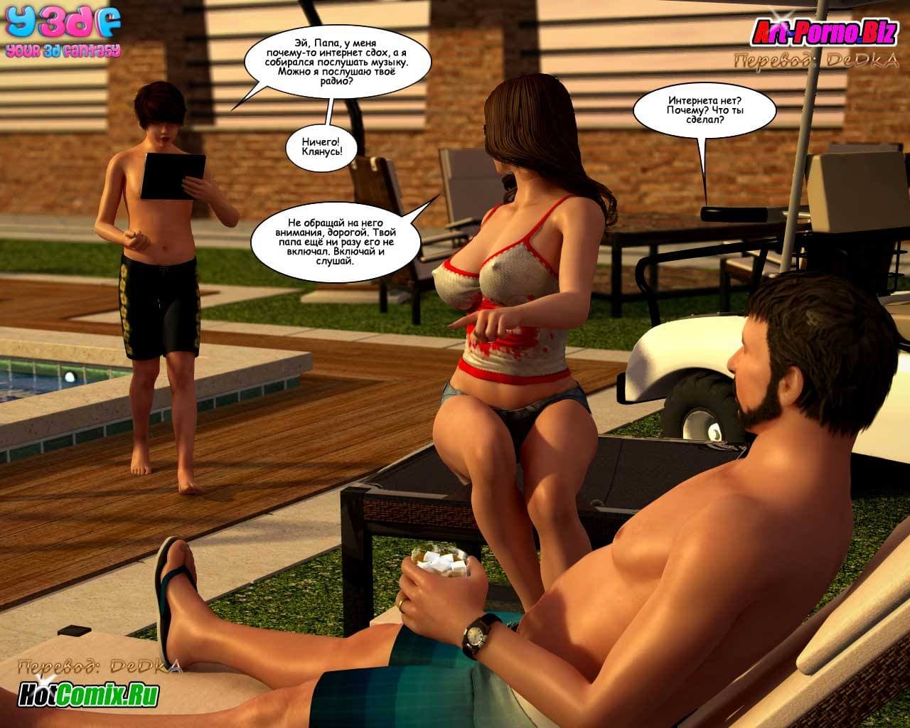 Любителям смотреть 3d порно комиксы на русском, предлагаем данное возбуждающее произведение, в котором все начинается с того, что семейство, состоящее из жены, ее мужа, младшей сестры и сына культурно наслаждаются отдыхом. В то время, пока женушка купается в бассейне, между ее мужем и младшей сестрой происходит жесткий разговор. Ведь та требует, чтобы он бросил её старшую сестру и женился на ней, как он и обещал, в тот момент, когда они в последний раз занимались сексом. Обескураженный мужик, отвечает, что мало ли чего он обещал, когда они наслаждались сексом! Нельзя же все сказанное во время траха воспринимать всерьёз! Ну, а сынок, в это же время снимает на свой новый планшет, вылезшую из бассейна зрелую и очень сексуальную мамочку с большими титьками, чтобы потом от души подрочить…