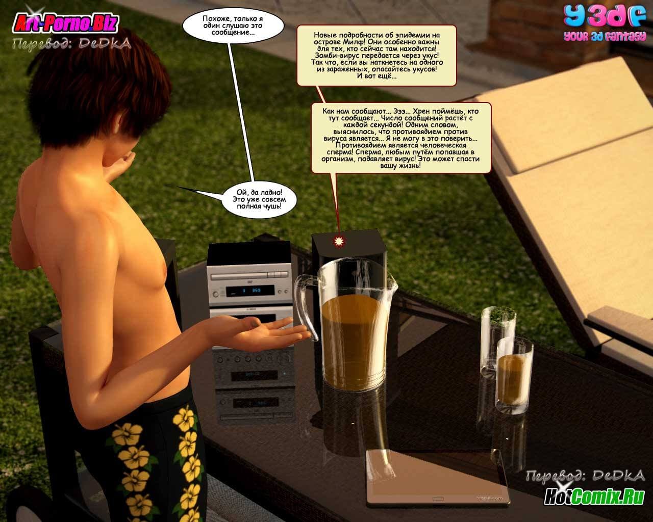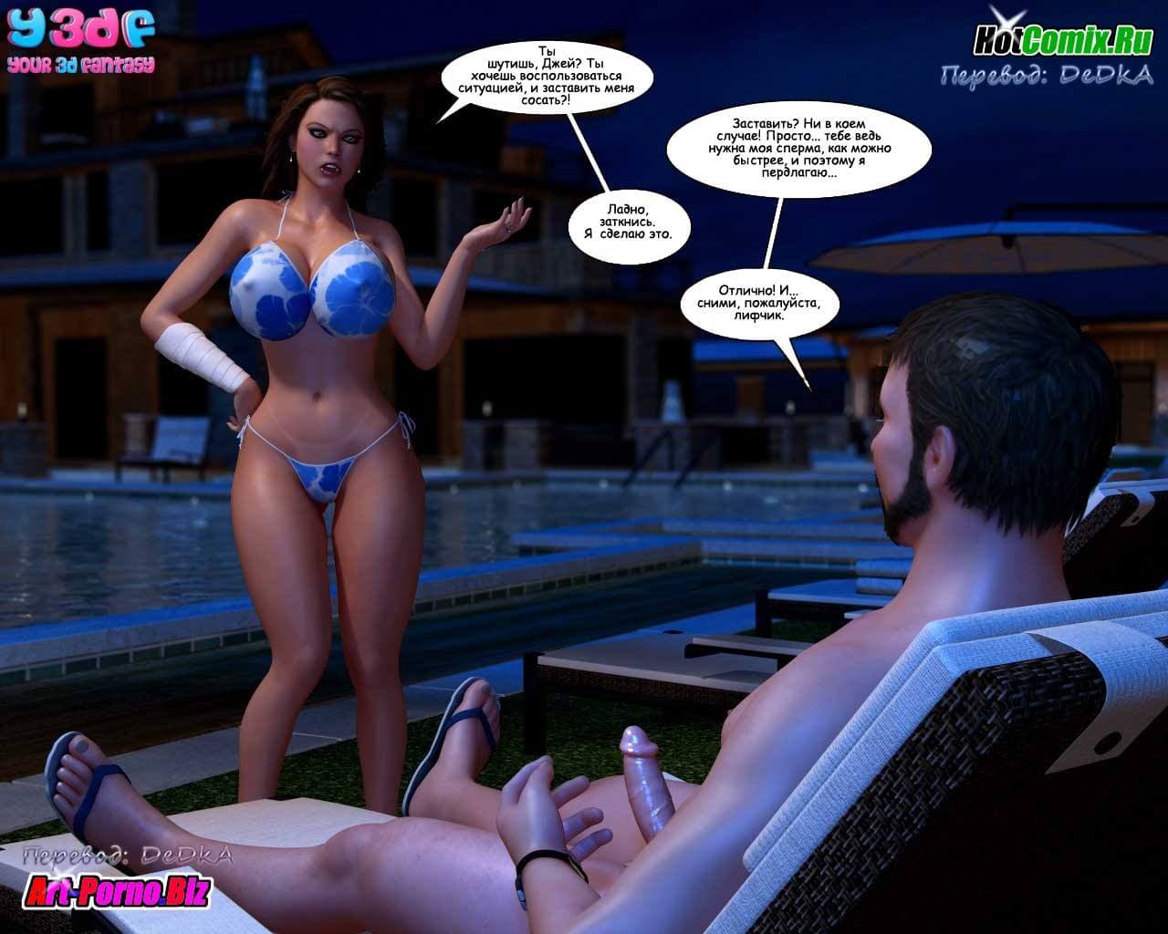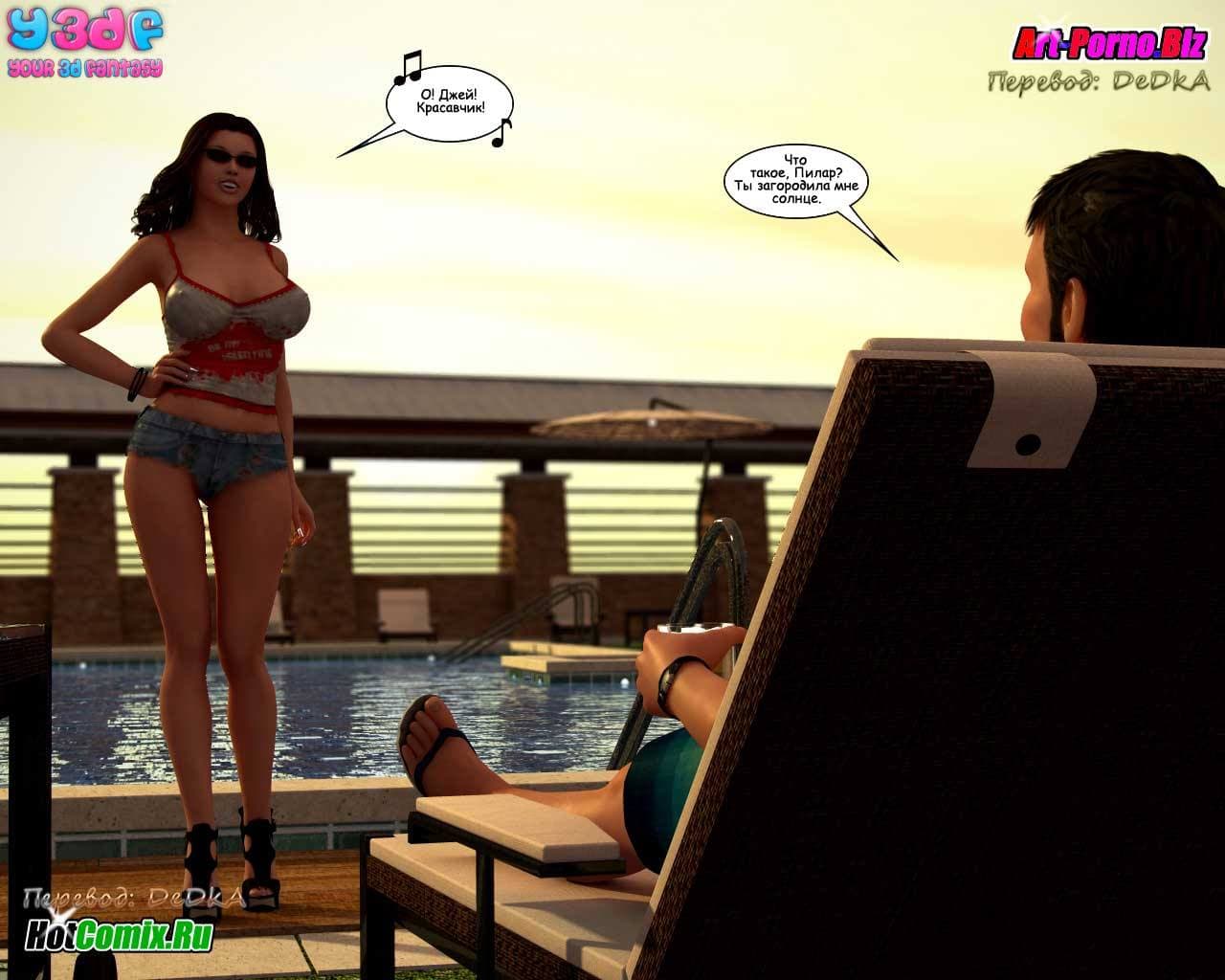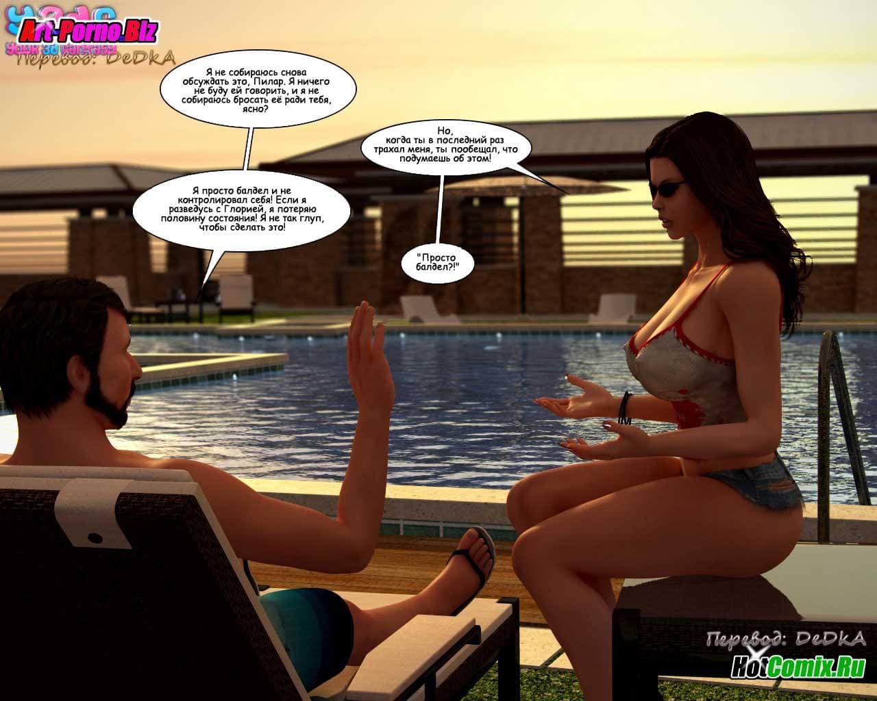 Любителям смотреть 3d порно комиксы на русском, предлагаем данное возбуждающее произведение, в котором все начинается с того, что семейство, состоящее из жены, ее мужа, младшей сестры и сына культурно наслаждаются отдыхом. В то время, пока женушка купается в бассейне, между ее мужем и младшей сестрой происходит жесткий разговор. Ведь та требует, чтобы он бросил её старшую сестру и женился на ней, как он и обещал, в тот момент, когда они в последний раз занимались сексом. Обескураженный мужик, отвечает, что мало ли чего он обещал, когда они наслаждались сексом! Нельзя же все сказанное во время траха воспринимать всерьёз! Ну, а сынок, в это же время снимает на свой новый планшет, вылезшую из бассейна зрелую и очень сексуальную мамочку с большими титьками, чтобы потом от души подрочить…