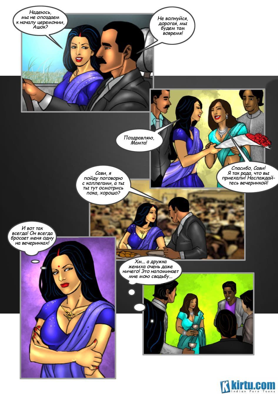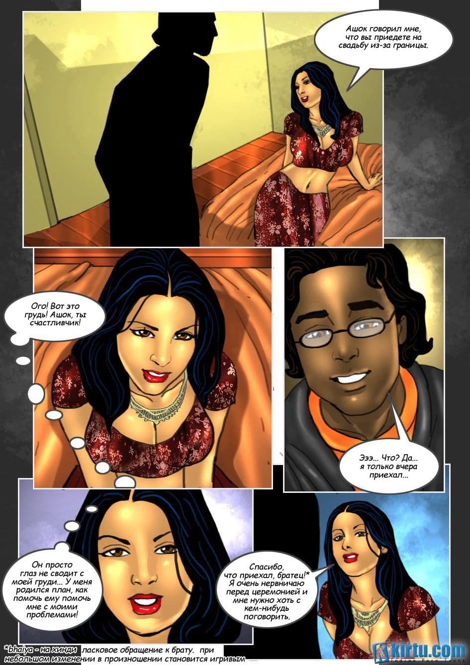 Комикс ххх покажет, как Ашок и Савита уезжают на венчание к их знакомой Мамте. Когда они приехали, муж нашей зной ной красавицы, к ее неудовольствию пошел к своим друзьям. А Савита придалась воспоминаниям о своей молодости и свадьбе. Ведь еще в юности она постоянно ублажала много мужчин, а в день бракосочетания она также смогла охмурить свидетеля со стороны жениха. Ашок же ничего не замечает, вот и в данный момент он направляет к Савите парня Према, чтобы тот составил компанию жене. А, что именно произойдет между молодым человеком и зрелой женщиной узнаете, прочитав эту историю на русском.