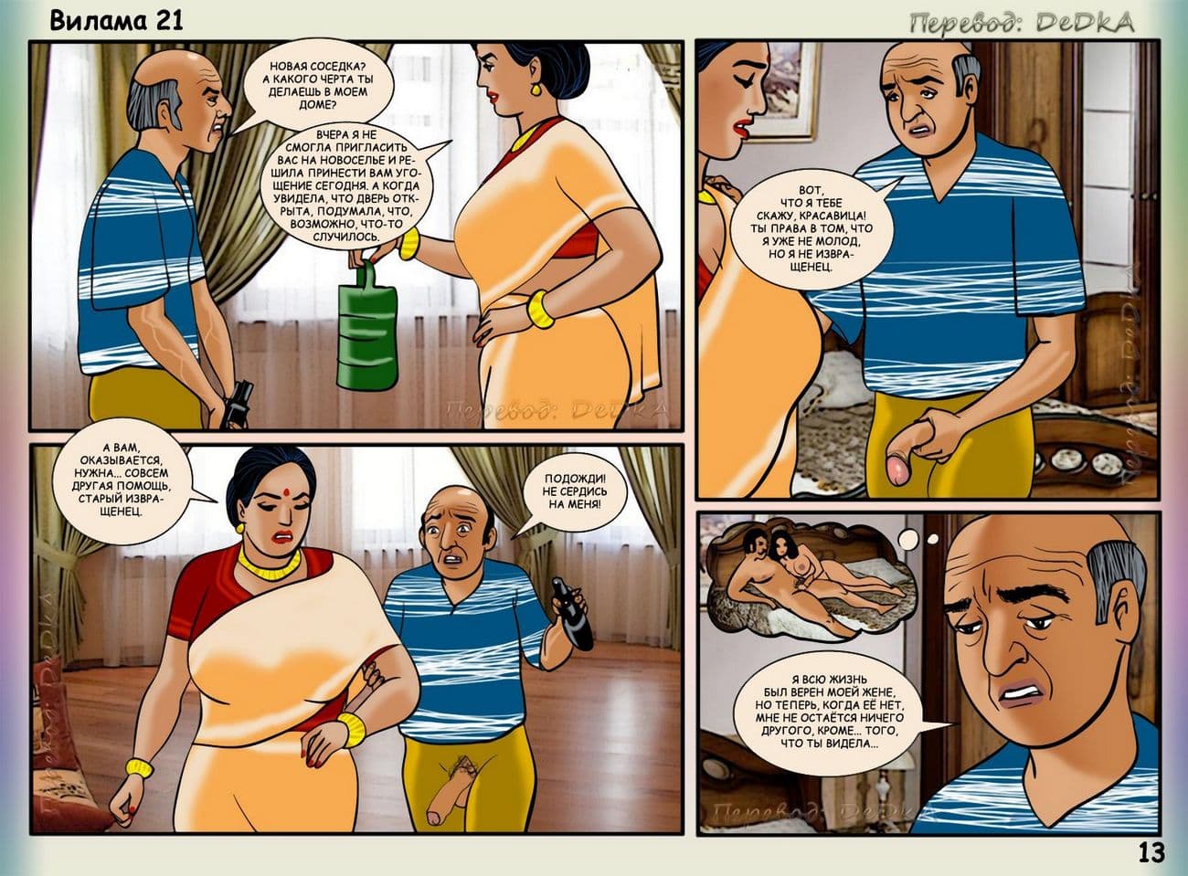 В данной части замечательного порно комикса Вилама и Рамеш решили устроить вечеринку в новом доме, чтобы познакомиться с соседями. Пришли все, кроме одного старичка. Зрелая Вилама захотела узнать почему он не явился и зашла к нему домой. Но там женщина застала его мастурбирующим свой большой член. Вилама была шокирована, а старик Шамир поведал ей о своей нелегкой судьбе, попросив нашу красавицу раздеться и показать взрослые прелести.