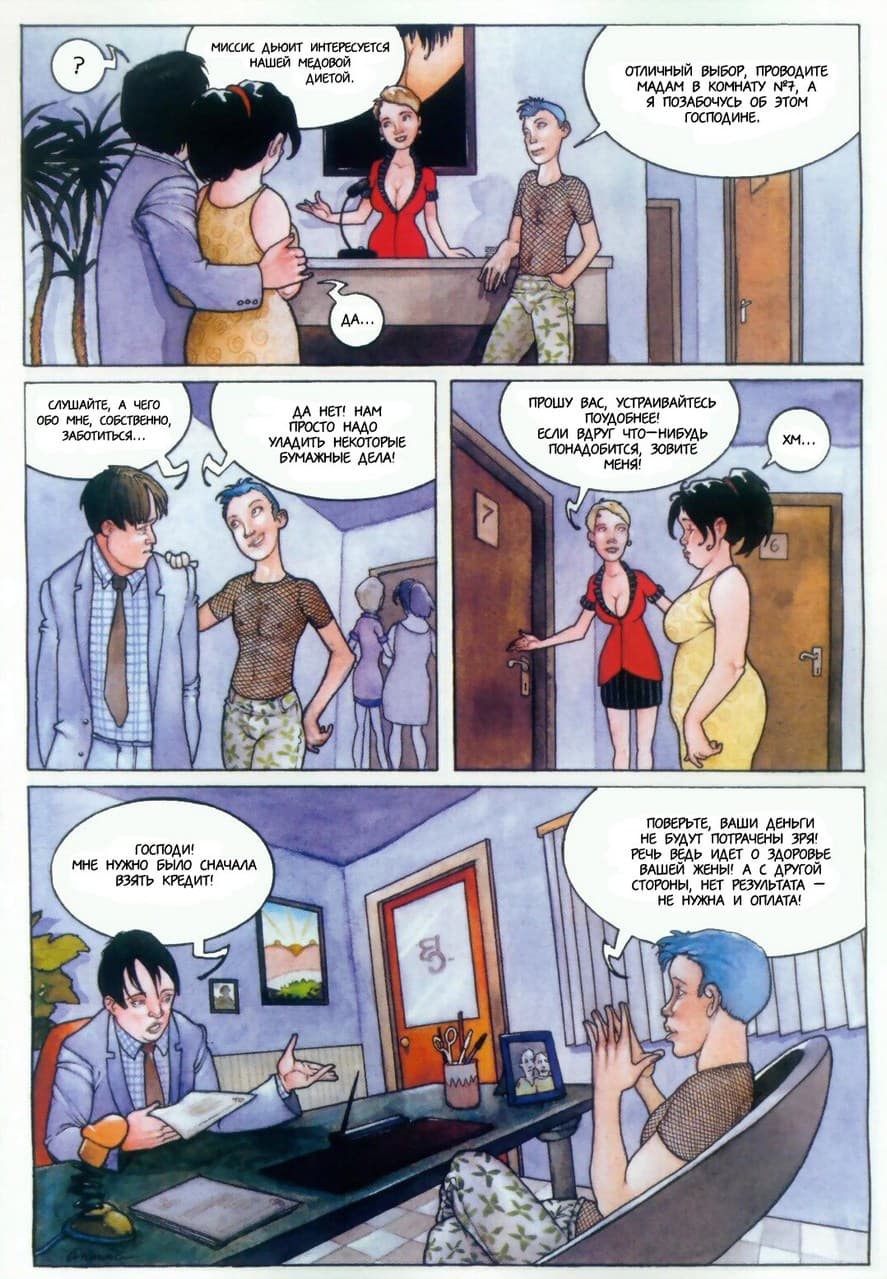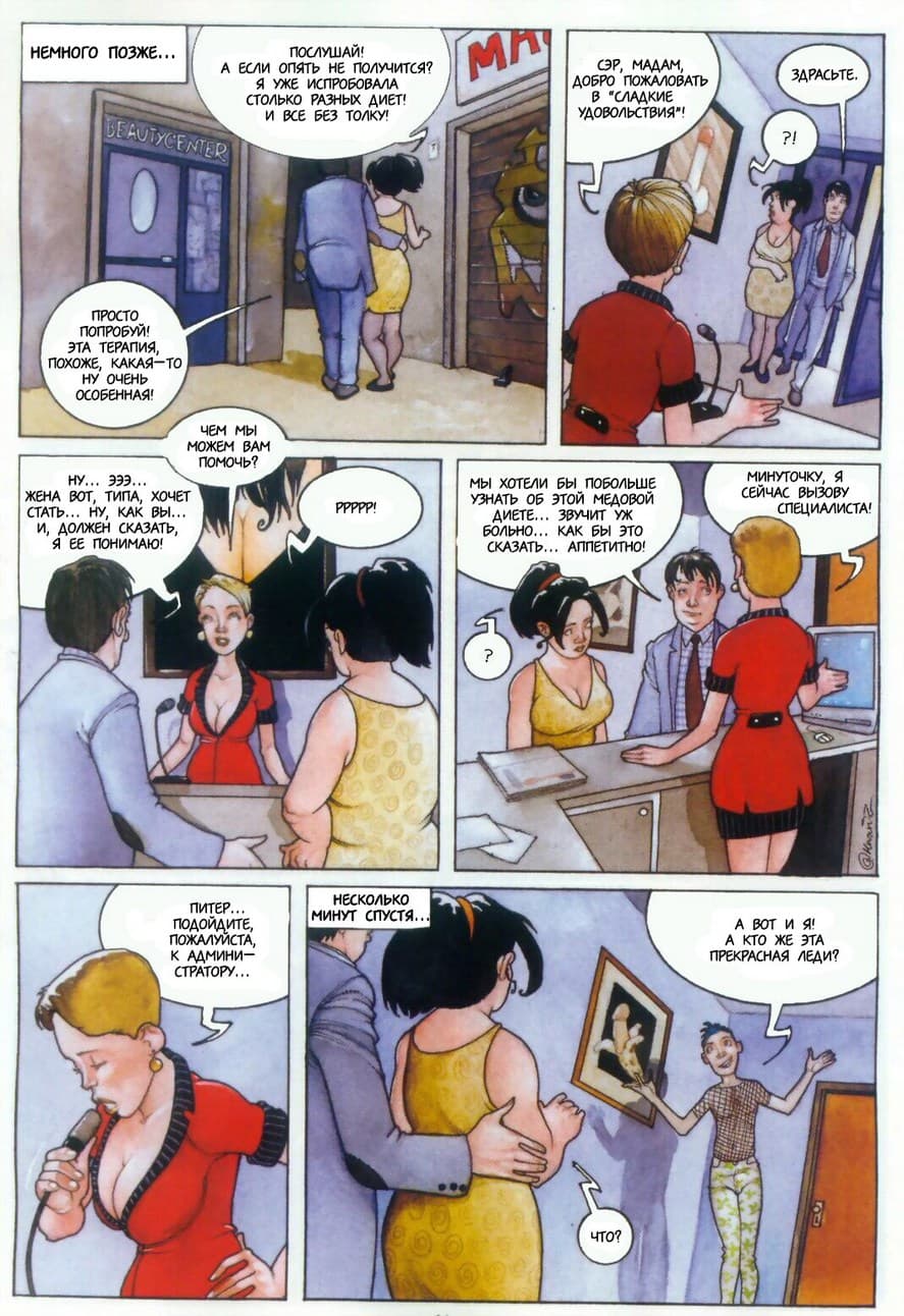 Комикс порнушка в картинках о полненькой женщине у которой началась депрессия по поводу лишних килограмм. Муж отвел ее в клинику по сбросу веса, где умелые специалисты провели с ней сексуально – медовый курс, после которого плохое настроение, как рукой сняло.