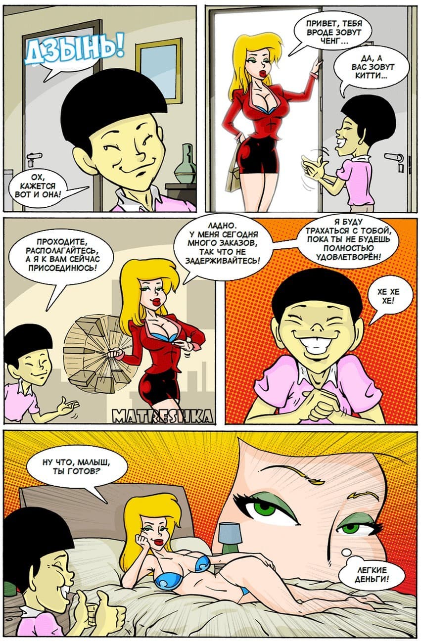 На нашем сайте вы всегда найдете порно комиксы новинки. Сегодня представляем вам историю о том, как девушка по вызову по имени Китти пришла по заказу одного китайского клиента Ченга. Не приступая к всяким разговорам и прелюдиям они начали трахаться. И все для шлюшки Китти было бы нормально, но Ченг, каким – то образом мог все время кончать и при этом, не уставая, снова требовал продолжения секса. Как же это ему удается???