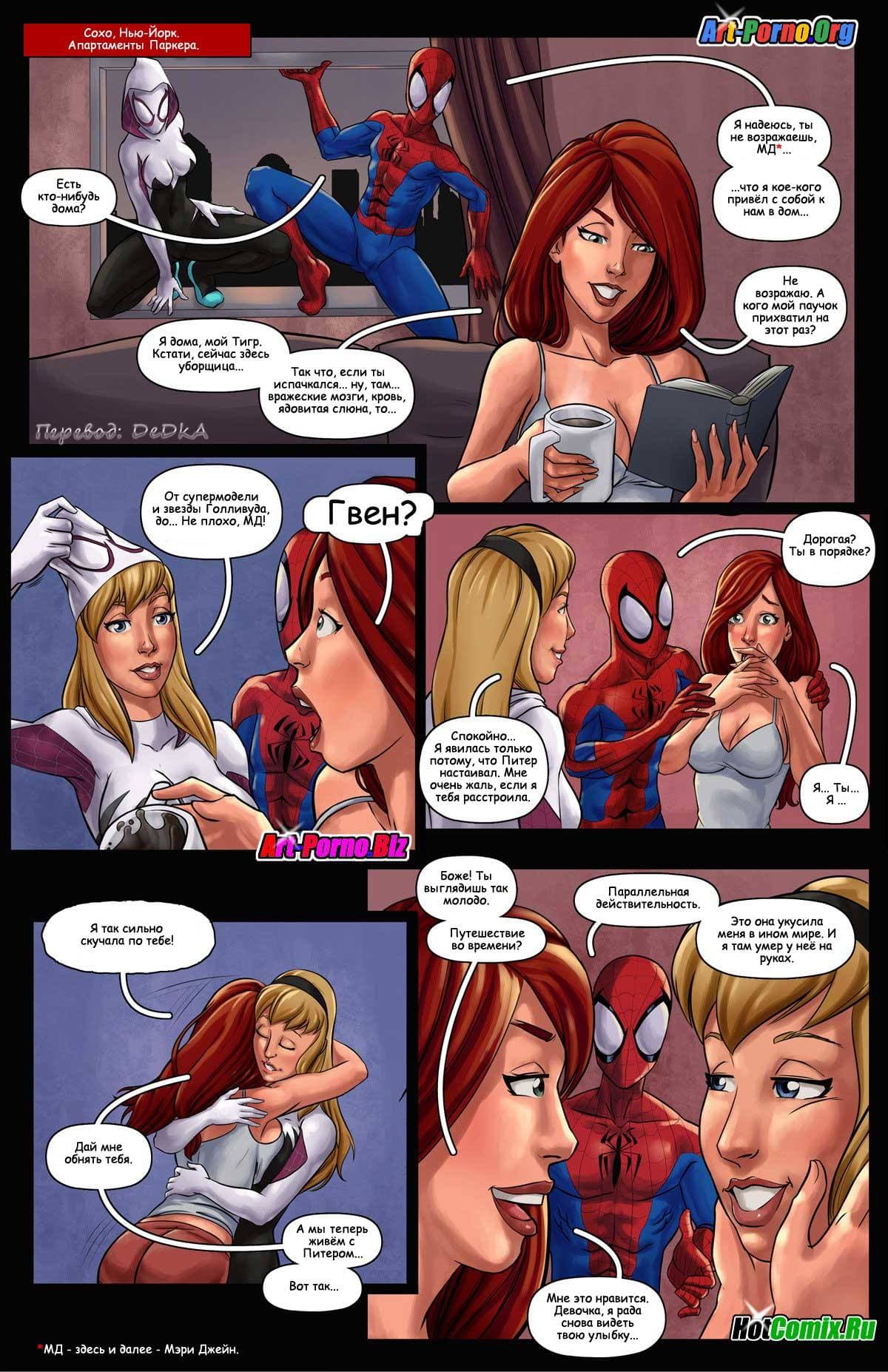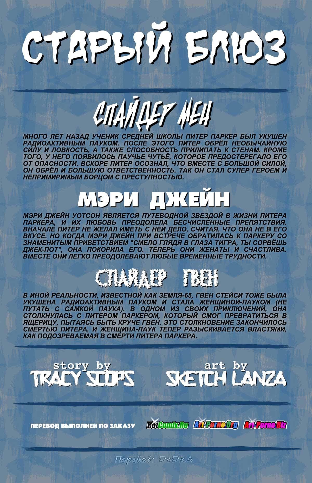 Порно комикс Старый блюз это пародия на «Человека-паука». Так с пределенных пор Мэри Джейн Уотсон и Питер Паркер живут счастливо в браке. Но все же прошлое никак не покидает их. Настает тот день, когда Питер возвращается домой из параллельной реальности вместе с Гвен Стейси, известной всем, как Спайдер Гвен. В том мире, откуда прибыла Гвен, все трое наворотили немало дел, и им, конечно, было что вспомнить за бутылкой дорогого вина. И вот, уже после нескольких бутылок друзья прониклись друг к другу очень нежными чувствами…