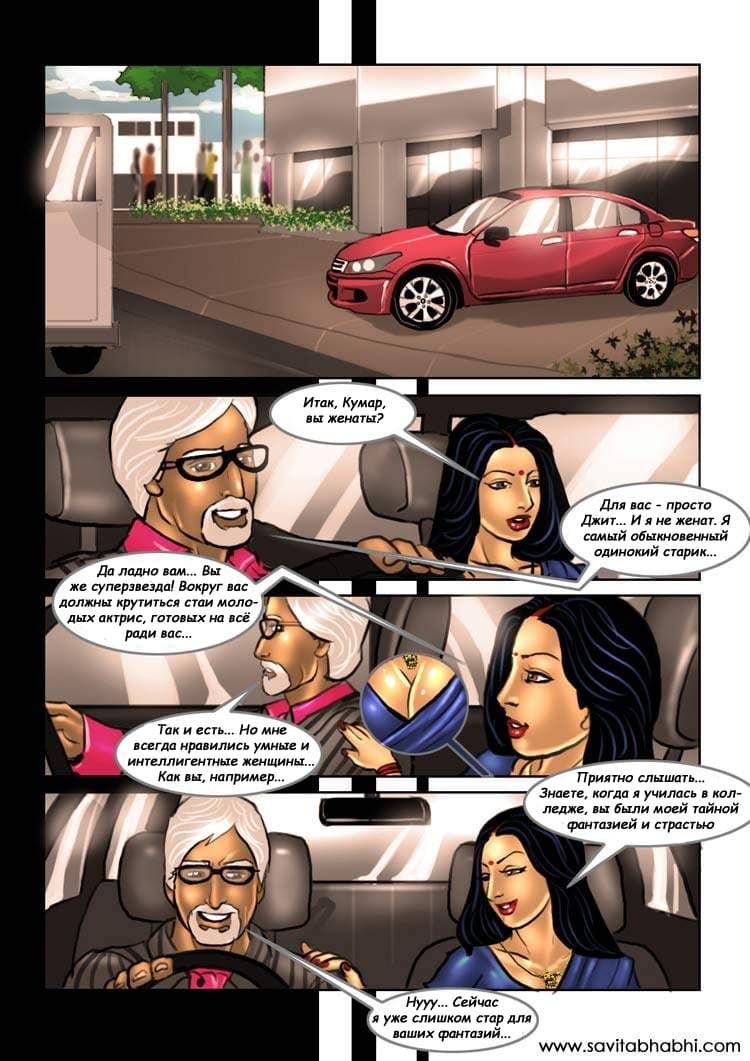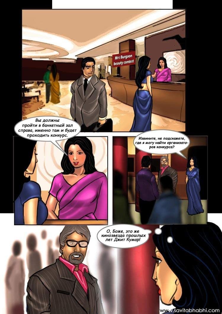 Данная часть эротического комикса на русском про зрелую женщину Савиту начинается с того, что ее отправляют по работе на конкурс красоты – Мисс Индия. Там она случайно встречается с кумиром ее юности – зведой кино Джитом Кумаром. Савита всегда хотела занятся с ним любовью, а сейчас выпал шанс устроить настоящее порно.