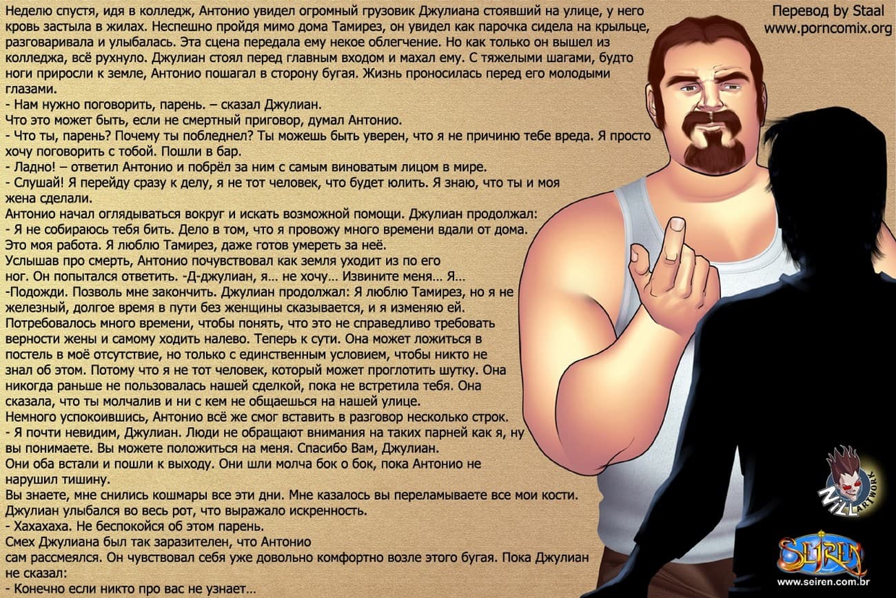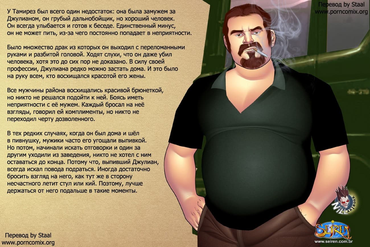 Откровенный порно эрокомикс в виде рассказа в картинках о Тамирез, самой соблазнительной женщине на районе. Большинство мужчин грезят о ней, но страх перед ее мужем не дает им перейти грани дозволенного. Только, как — то раз, Тамирез решила попросить молодого парня Антонио помочь ей в настройке нового телевизора. Здесь, то и закручивается весь возбуждающий сюжет данного произведения.